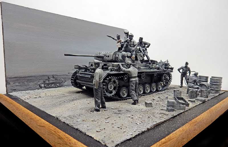 The aim here is to create a diorama in... black & white! See sepia. Like an old vintage photo. You could simply paint the whole thing in color and then modify it in software. But direct processing opens up interesting perspectives on paintwork...