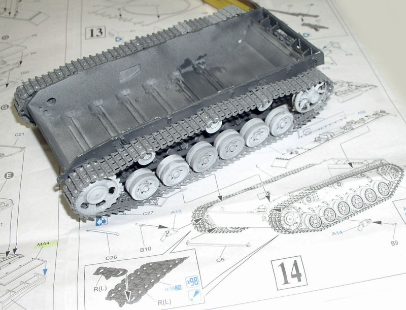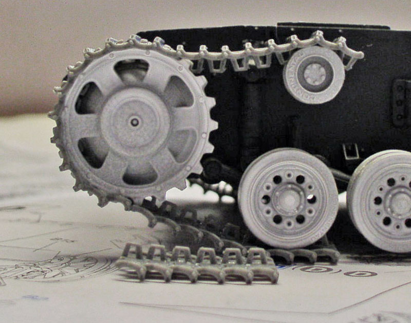 First problem: the undercarriage. The tracks are delivered track by track. They have to be sanded down one by one, and then gluing begins with the front transmission drive sprockets...