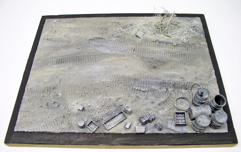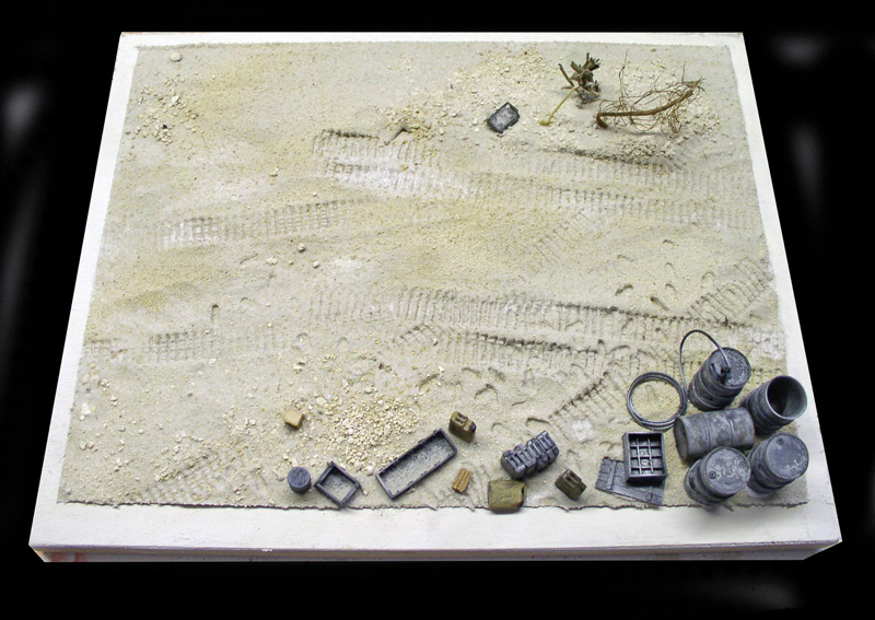 On ajoute les différents sables et cailloux puis on imprime les traces de chenilles et de pas...