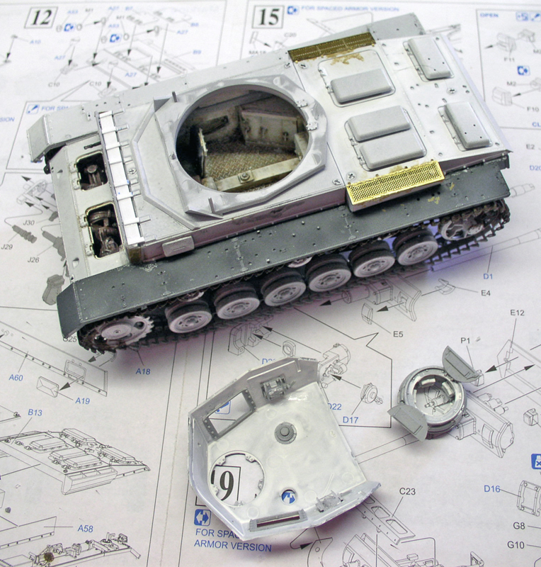 Installation of the upper body with photoetched air filters. Front armour plate fixings are improved to fit perfectly....