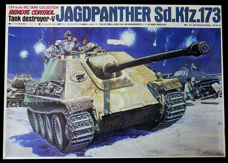 Le Jagdpanther de la marque BANDAI à l'échelle 1/24ème - une très belle pièce, bien qu'ancienne qui avoisine avec le canon les 45 cm ! Il est fourni avec une télécommande - à monter sois-même ! - et un kit d'entraînement pour l'axe avant si vous décidez de le faire mobile. A noter qu'il existe également un Panther (qui fera l'objet d'un prochain tutorial) et un Tigre B à cette échelle...