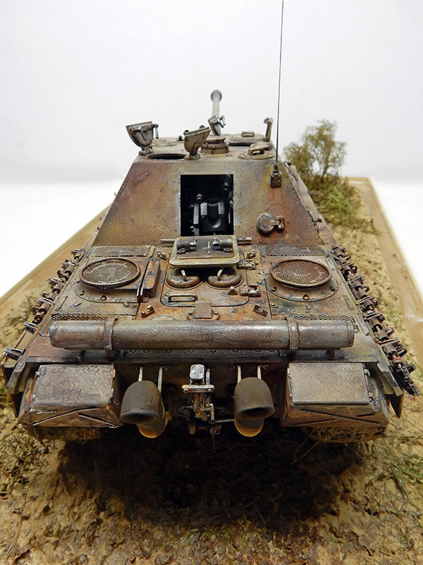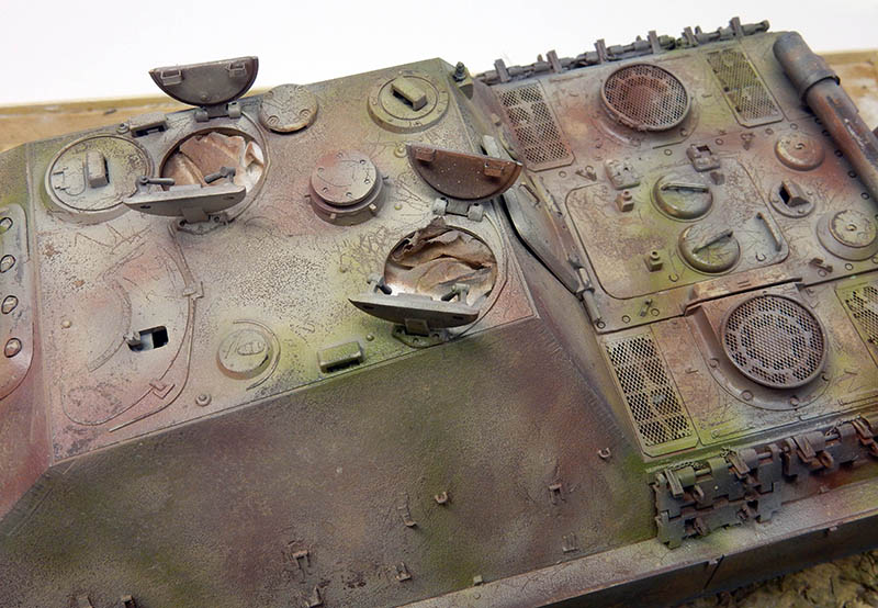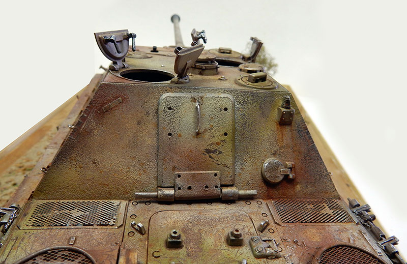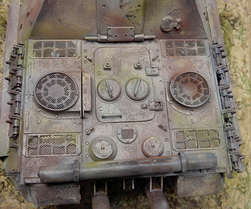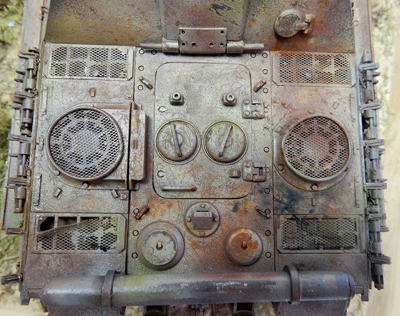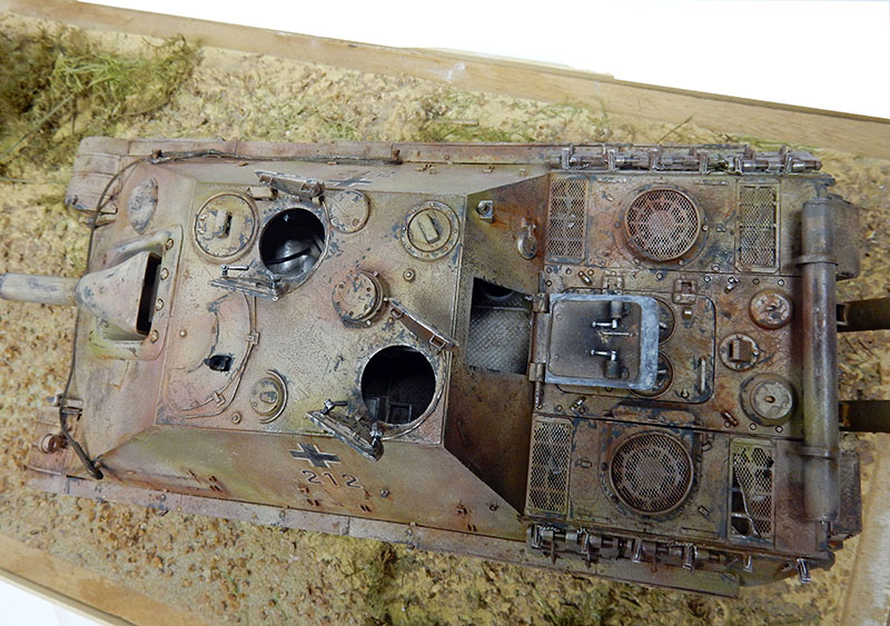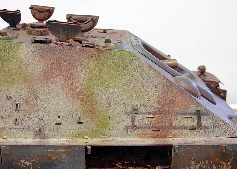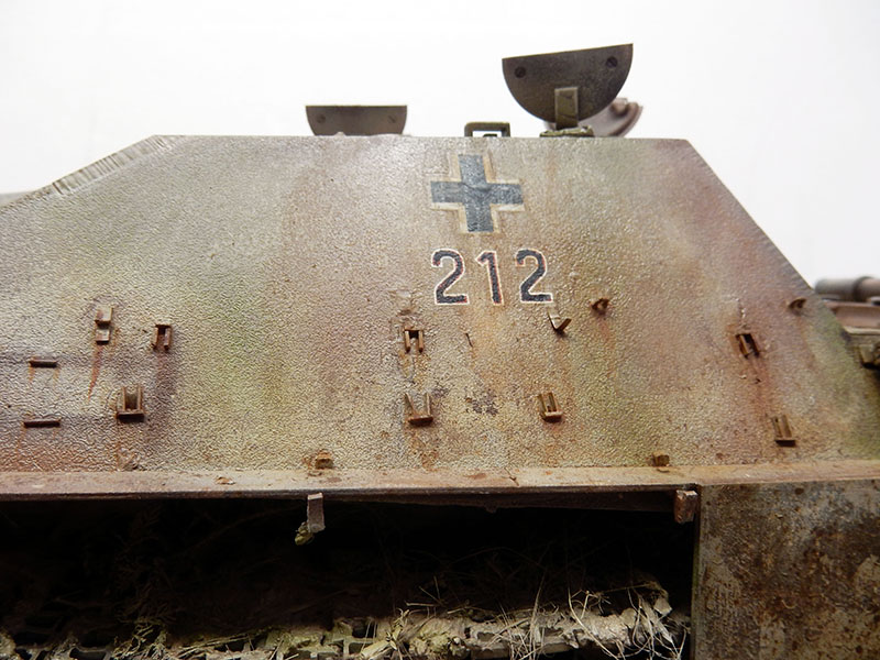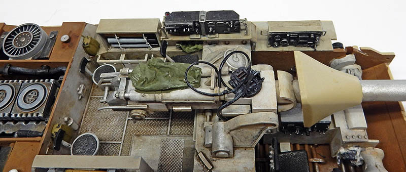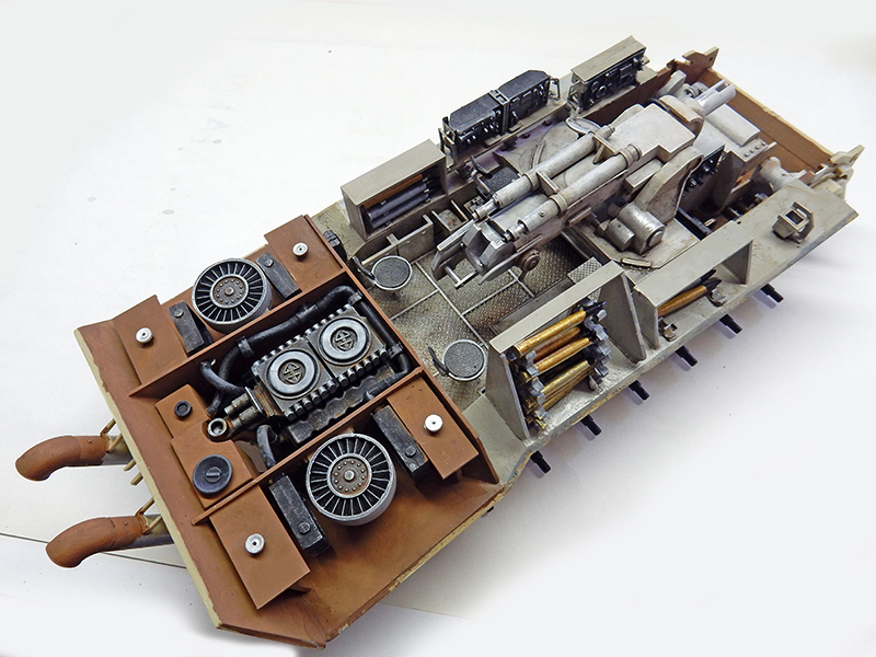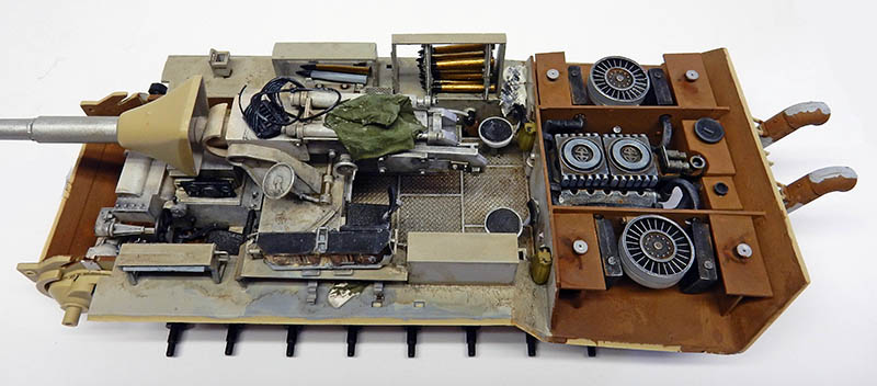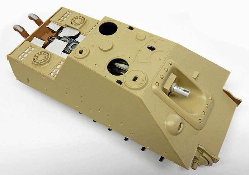 La structure est redétaillée. Le véhicule étant un modèle tardif, l'équipage a vite compris que les outils disposés sur les côtés de la caisse disparaissaient rapidement sous les tirs ennemis, n'a donc plus rien mis à ces endroits-là. Des attaches et crochets sont ajoutés On dispose également sur la plage arrière le kit d'entretien du canon. Des fixations des patins de rechange et chaînettes manquantes sont ajoutées. Le coffre arrière gauche est légèrement enfoncé et les sculptures refaites...