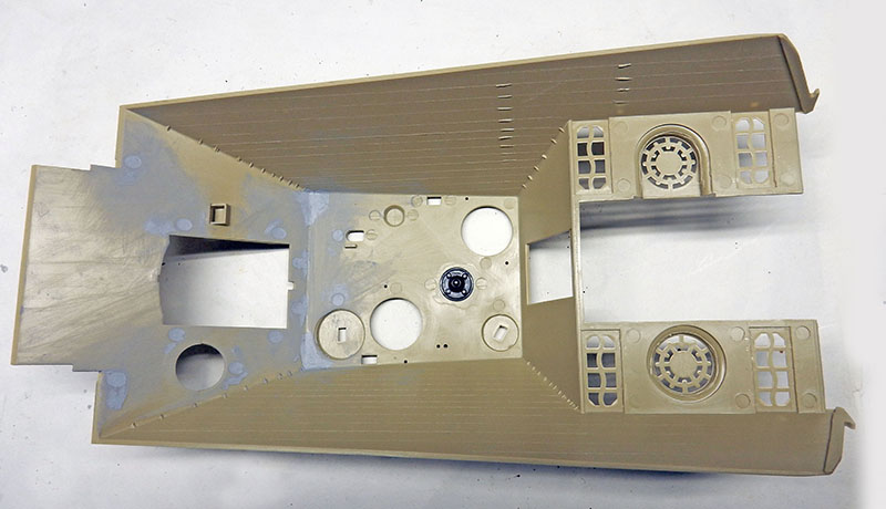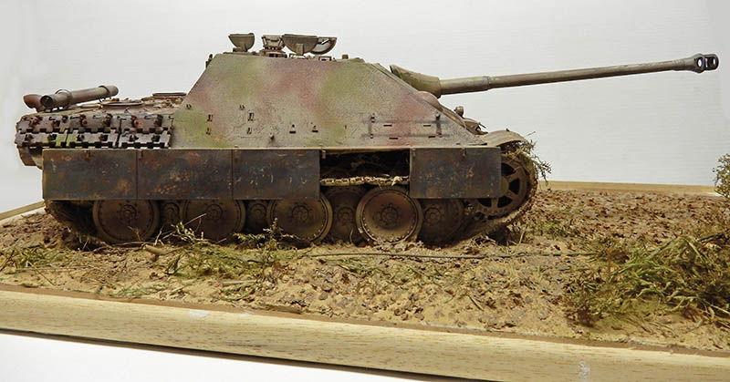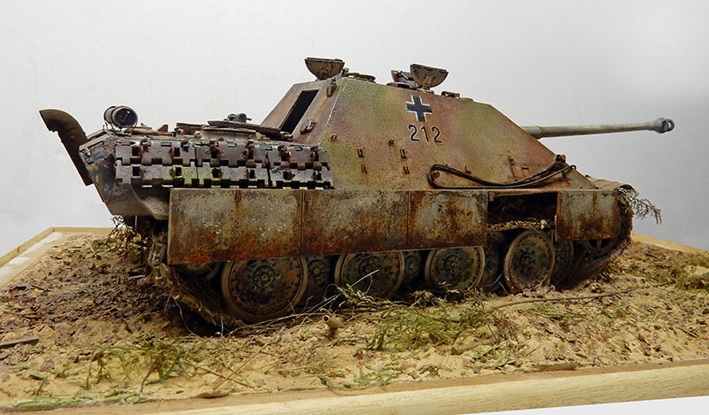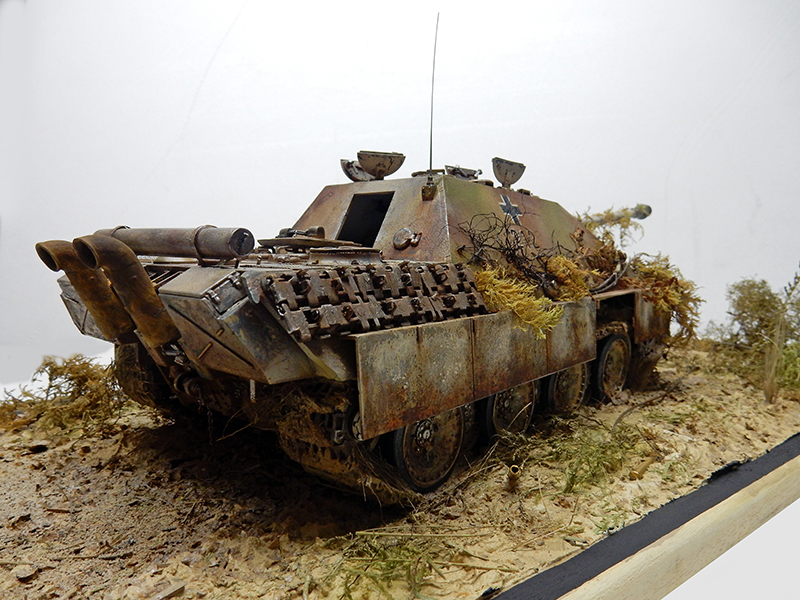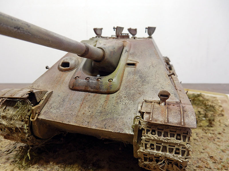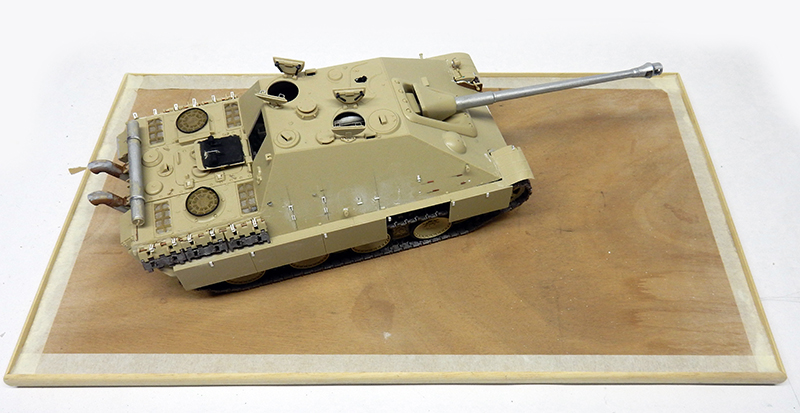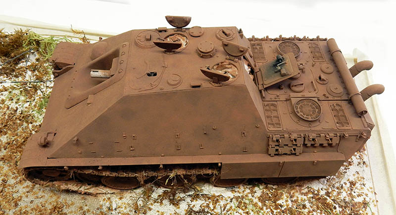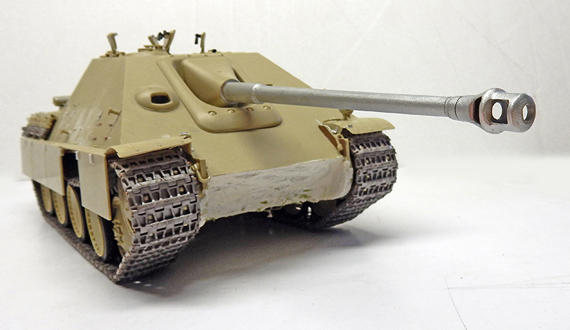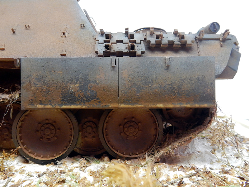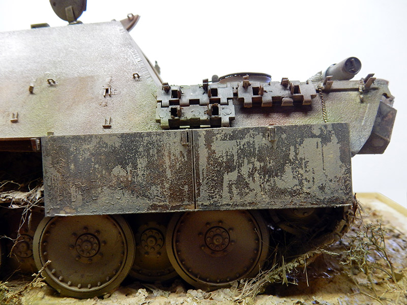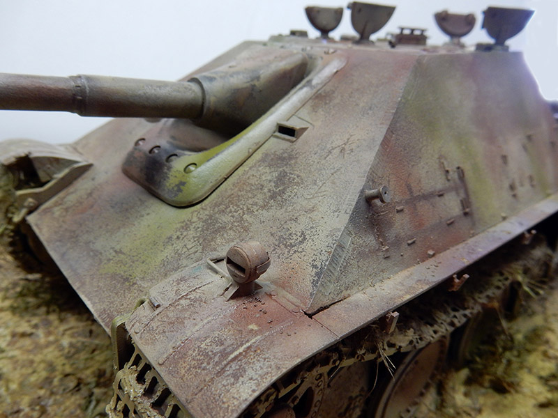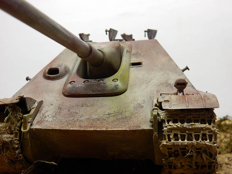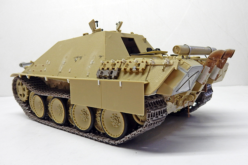 La structure est redétaillée. Le véhicule étant un modèle tardif, l'équipage a vite compris que les outils disposés sur les côtés de la caisse disparaissaient rapidement sous les tirs ennemis, n'a donc plus rien mis à ces endroits-là. Des attaches et crochets sont ajoutés On dispose également sur la plage arrière le kit d'entretien du canon. Des fixations des patins de rechange et chaînettes manquantes sont ajoutées. Le coffre arrière gauche est légèrement enfoncé et les sculptures refaites...