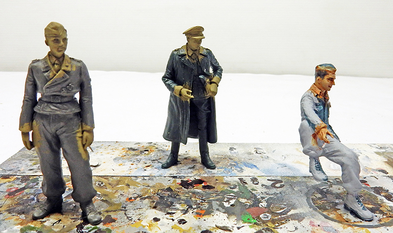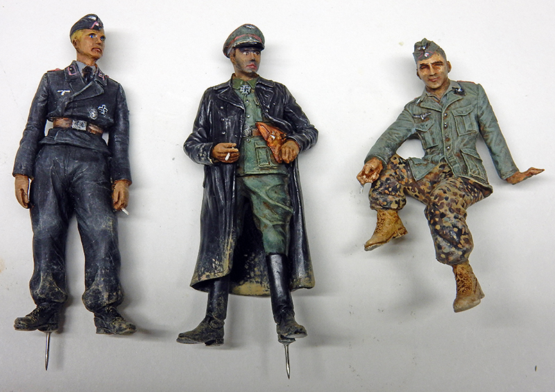 The faces and hands are treated with Winsor & Newton oil, as are the seated soldier's belts, pistol holster and shoes, while the uniforms are painted with Humbrol oil. The uniforms are painted with Humbrol oil. The officer's leather coat and boots are patinated with graphite on matte black...