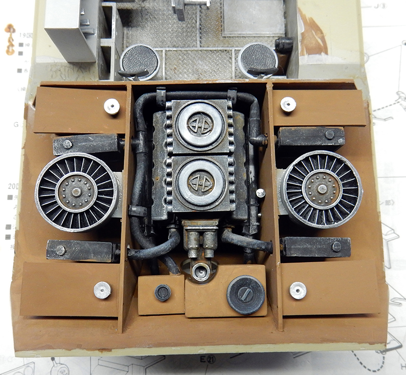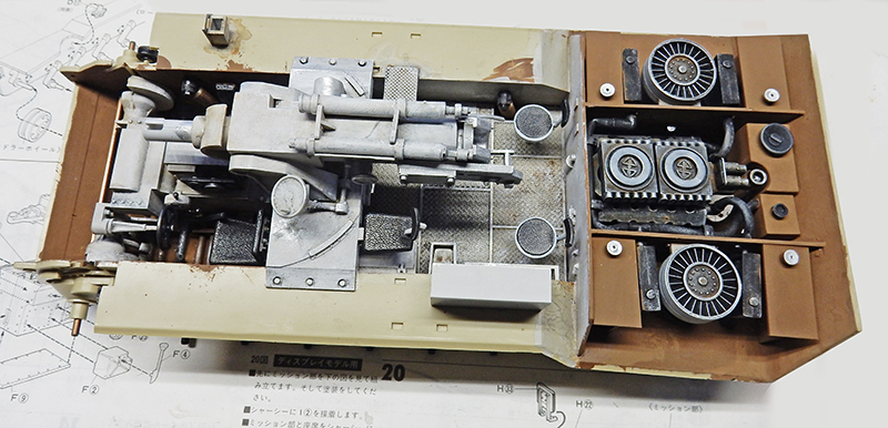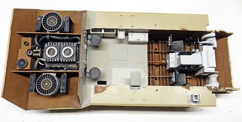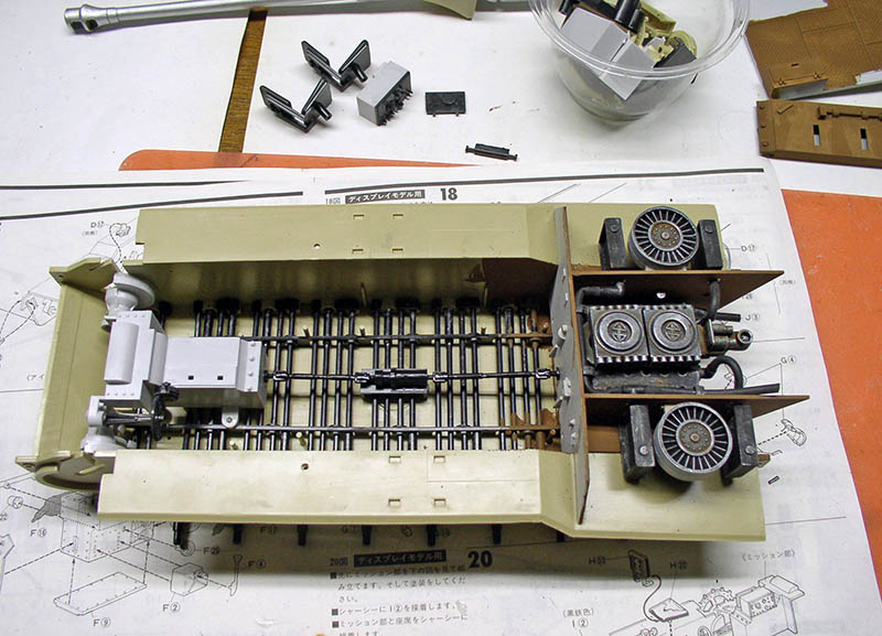 Body assembly. The transmission is installed, along with all the supplied axles for both undercarriages. The engine compartment is fitted, then the painted and weathered engine is glued in place...
