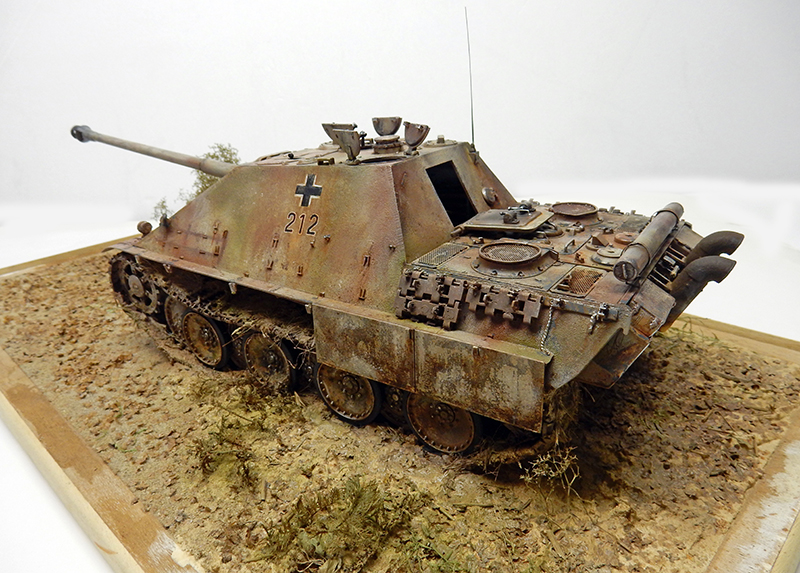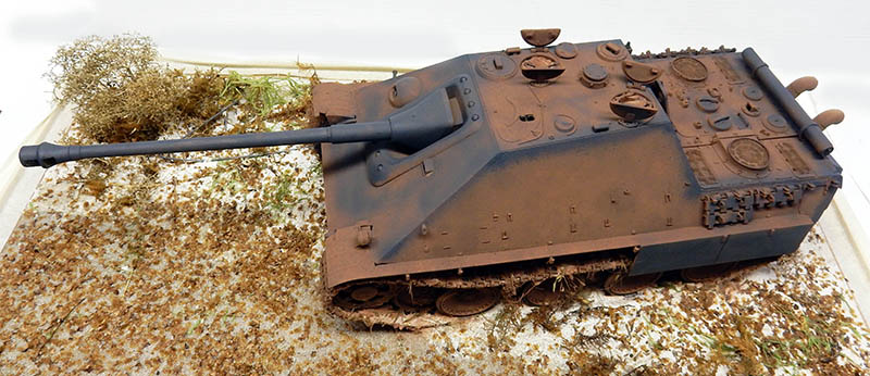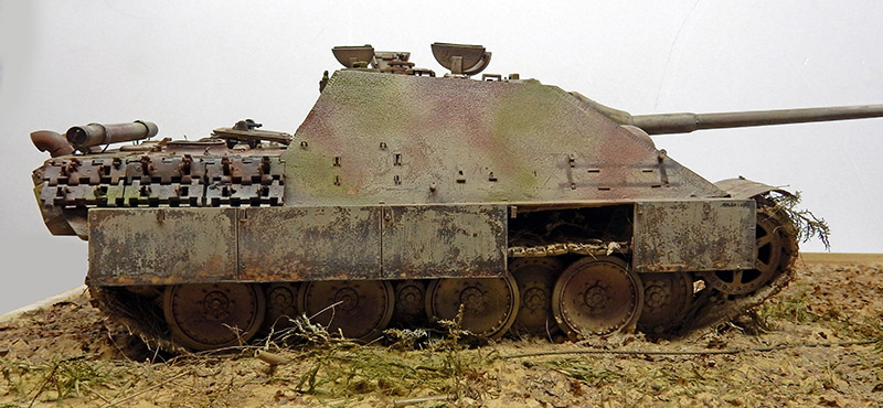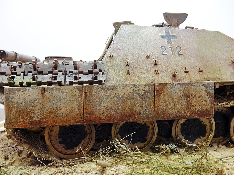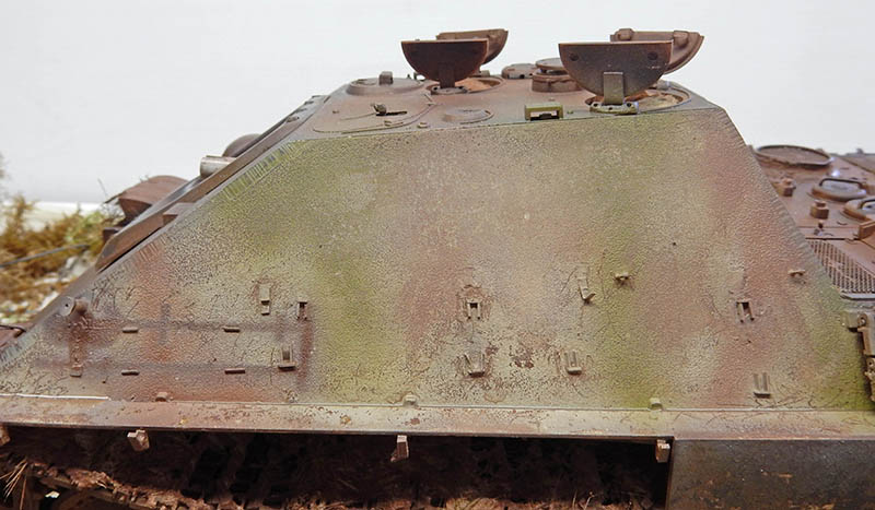 The structure has been improved. As the vehicle is a late model, the crew quickly realized that the tools on the sides of the body would quickly disappear under enemy fire, so nothing was placed there. Fasteners and hooks are added. The gun maintenance kit is also placed on the rear deck. Fasteners for spare skids and missing chains have been added. The left rear trunk is slightly depressed and the treads redone...