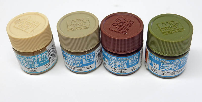 Une photo montrant les peintures originales utilisées pour le camouflage. Le vert est éclairci sur la maquette pour paraître moins éclatant...