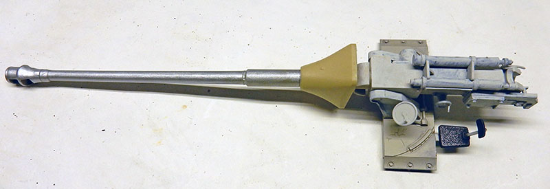 Le canon est collé sur sa base. Quelques détails sont ajoutés, boulons, pattes, en fonction de la documentation. Le tout est peint à base de gris clair et de blanc Humbrol en dry-brush puis sali avec des jus Terre d'ombre, Terre de sienne, Jaune de Naples...