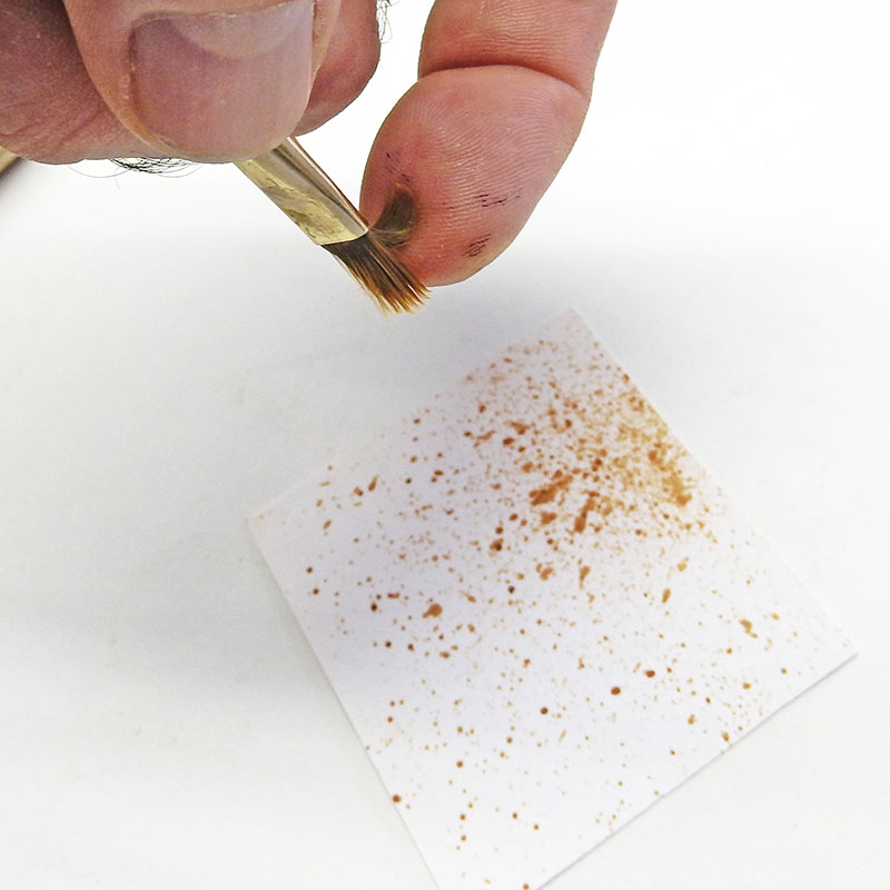 Les éclaboussures vont nous servir à compléter les effets de rouille et d'usure diverses. On utilise un pinceau plat souple que l'on replie pour effectuer l'effet...