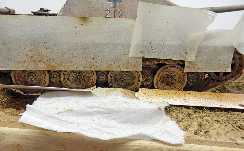 Le traitement des galets. On a procédé - quelques images plus haut - à la dépose de gris autour de l'axe des galets, et, après un dry-brush avec du gris clair et les couleurs de camouflage, on effectue des éclaboussures en protégeant les autres parties du véhicule et le sol...