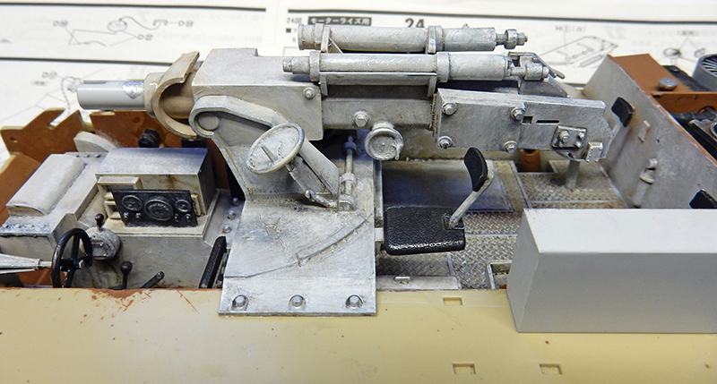 Trying to position the gun on its seat. The fuel tanks, missing from the model, have been added. Made from plastic card...
