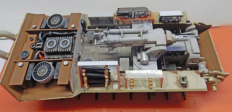 L'aménagement intérieur étant assez succinct sur la maquette, fabrication des casiers à obus, des étagères et des postes de radios FU-15 et FU16. Le tout en carte plastique...
