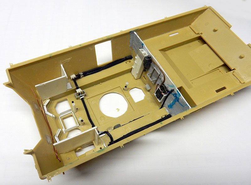 Une vue arrière, avec notamment les câbles divers ajoutés. Les portes latérales collées en position ouvertes, recevront un jerrycan avec son support...