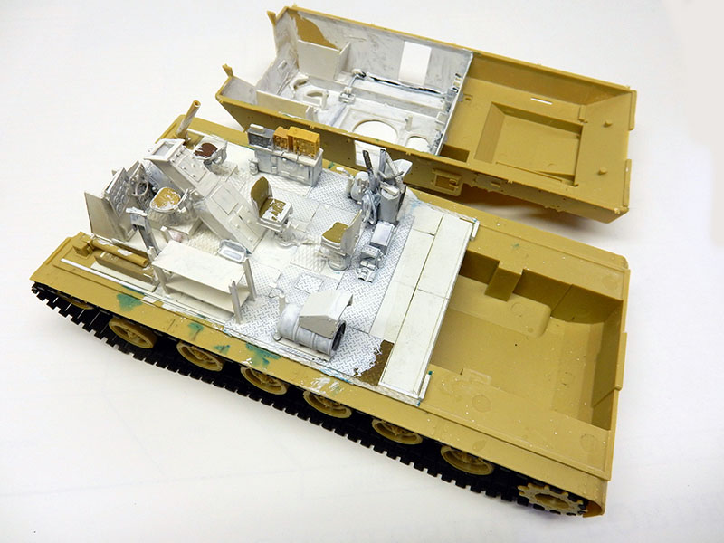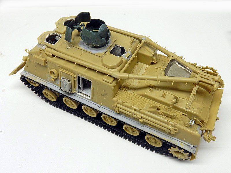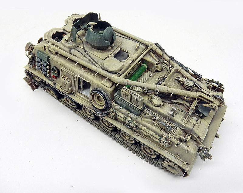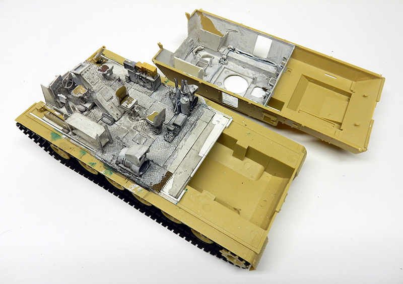 Puis on passe à la peinture finale avec dry-brush. La tourelle ACAV - ajoutée au kit - est peinte également. L'emplacement supérieur de la caisse a été élargi et le tourelleau d'origine éliminé...