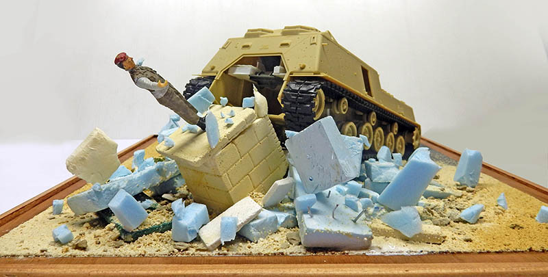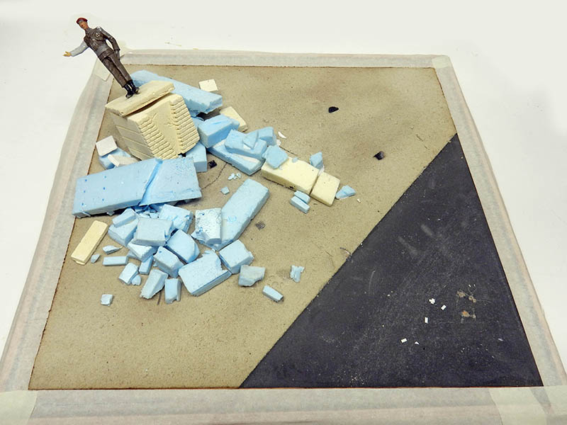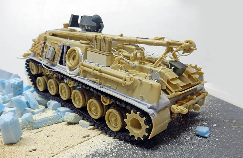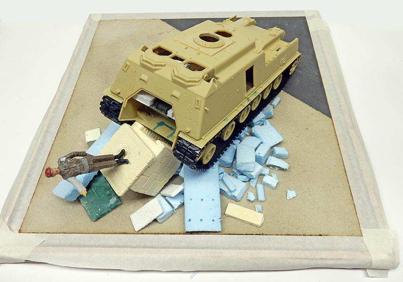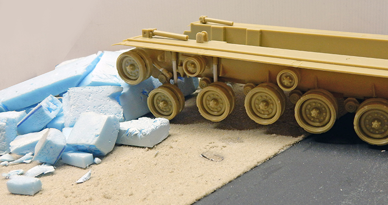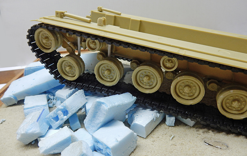 On allonge la suspension à l'aide de baguettes d'Evergreen, on pose les chenilles après avoir installé tout le train complet, puis on commence à disposer les dalles de béton et gravats sculptés en polystyrène extrudé pour définir l'emplacement exact...