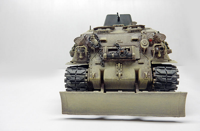A noter qu'un écaillage avec un pinceau fin à base de vert foncé Humbrol est effectué sur la lame dozer et les barres de remorquage...