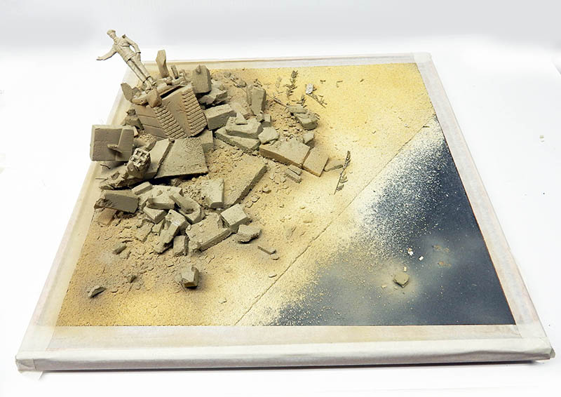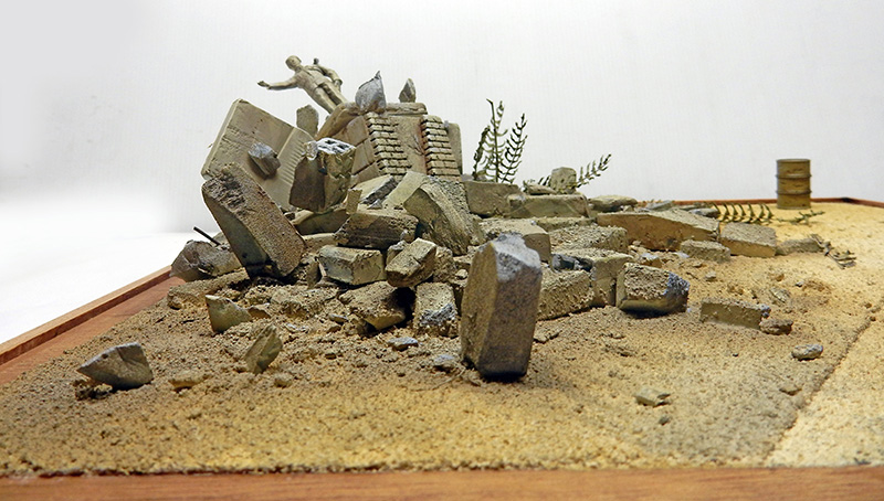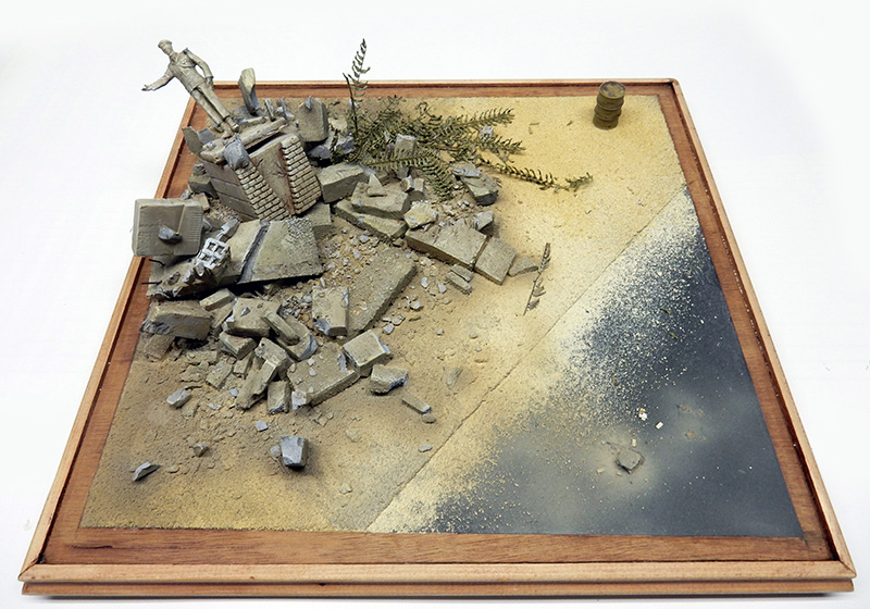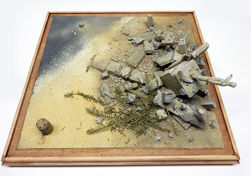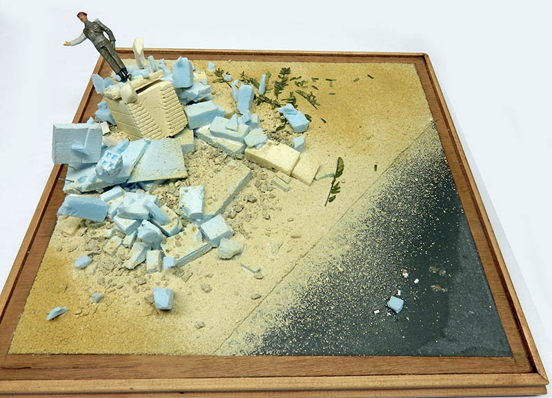 Le décor finalisé. Des gravats sont ajoutés ainsi que des plantes (feuilles de mimosa séchées)...