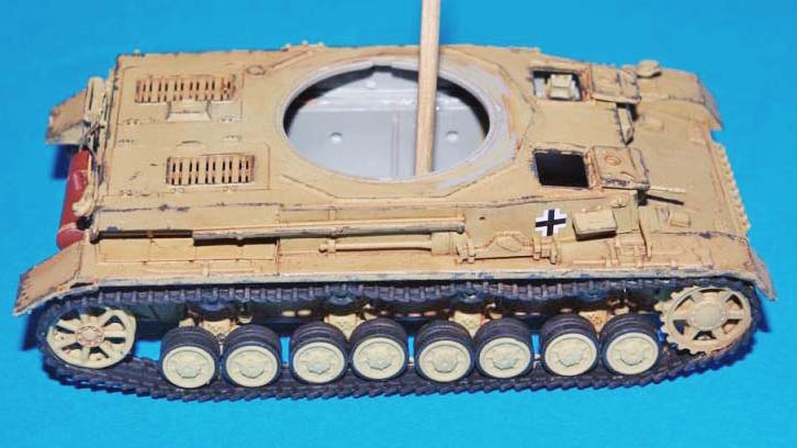 The tracks and rubber tyres on the wheels are painted black, the exhaust pipe is rusty brown, and the scuff marks begin in Panzer 67 gray... the original color of this Panzer!