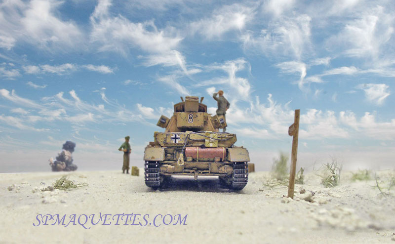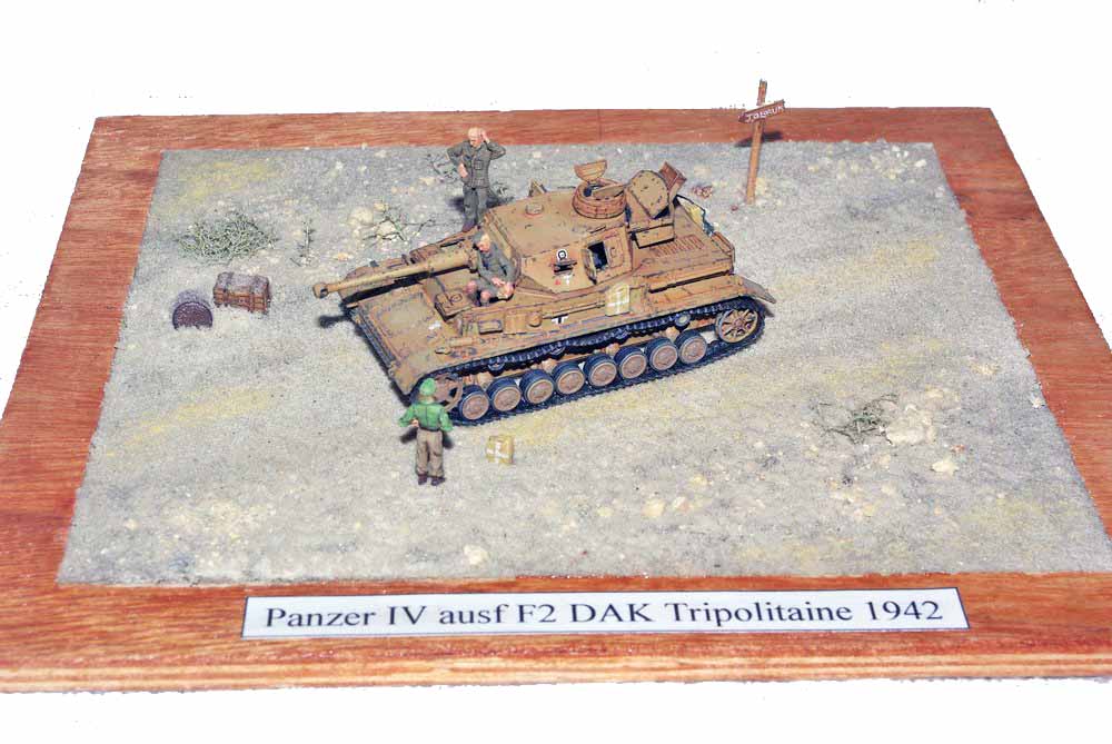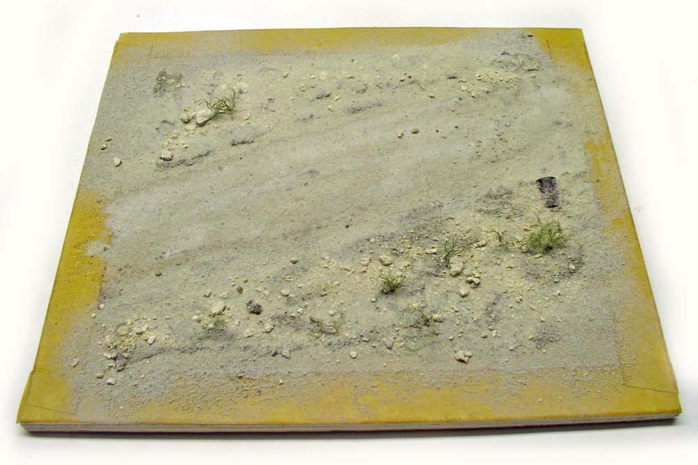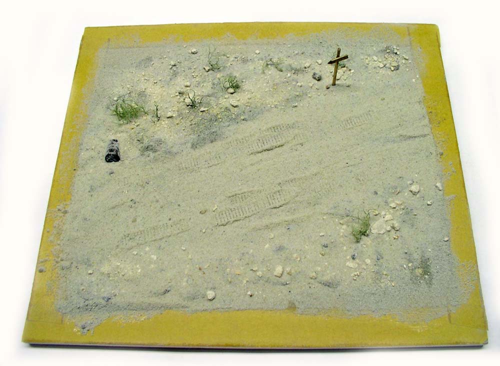 Le diorama qui est très simple (il sert juste à mettre le char en valeur) tout en apportant vie et localisation de la scène, est réalisé à partir d'un contreplaqué fin carré d'une vingtaine de centimètres sur lequel on étale une généreuse couche de colle blanche. Puis on saupoudre de sable fin et de granulat d'enduit de façade...