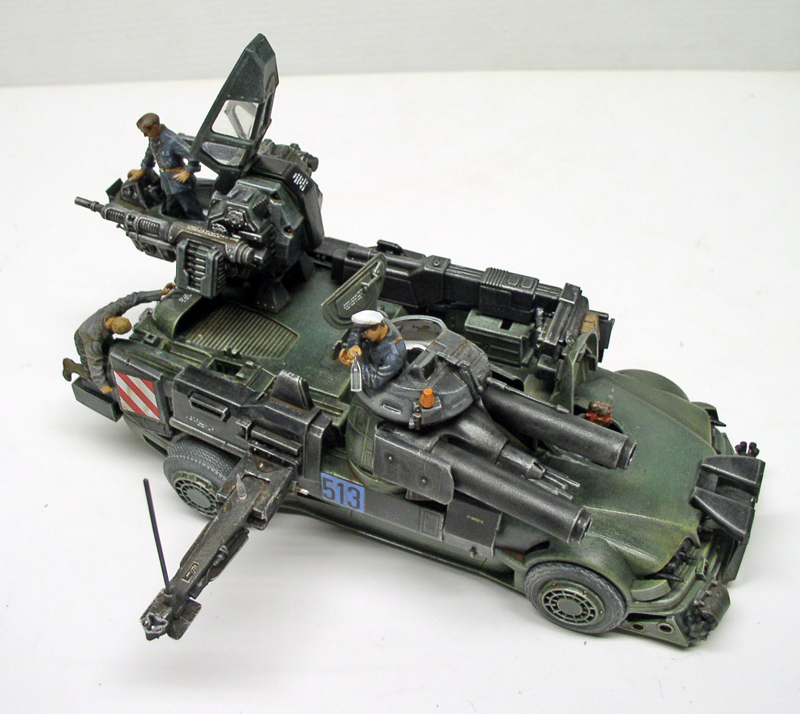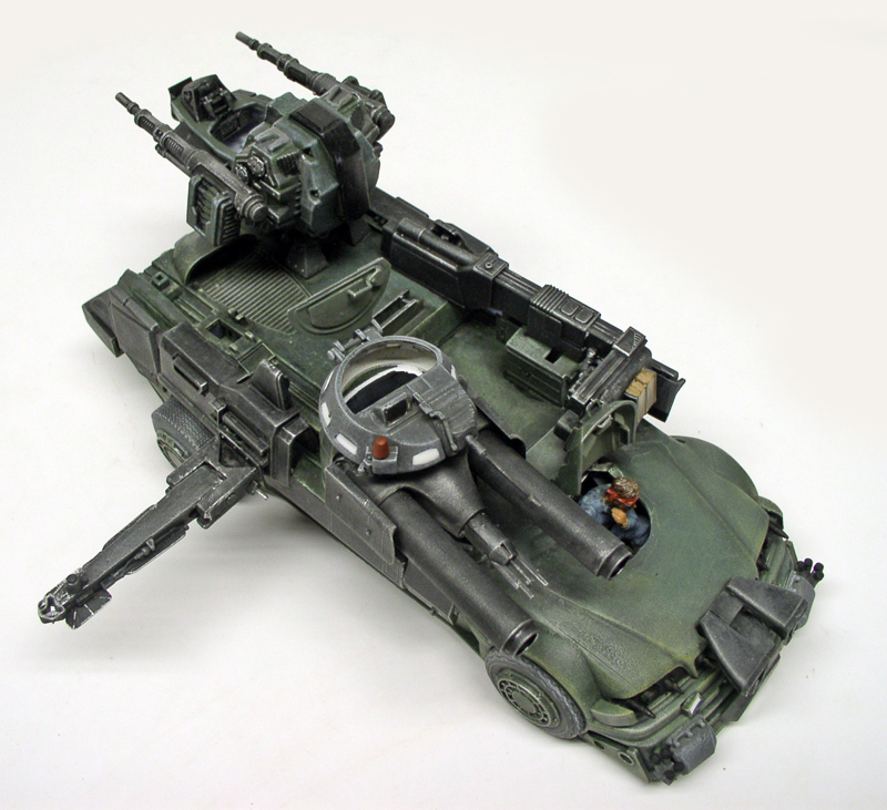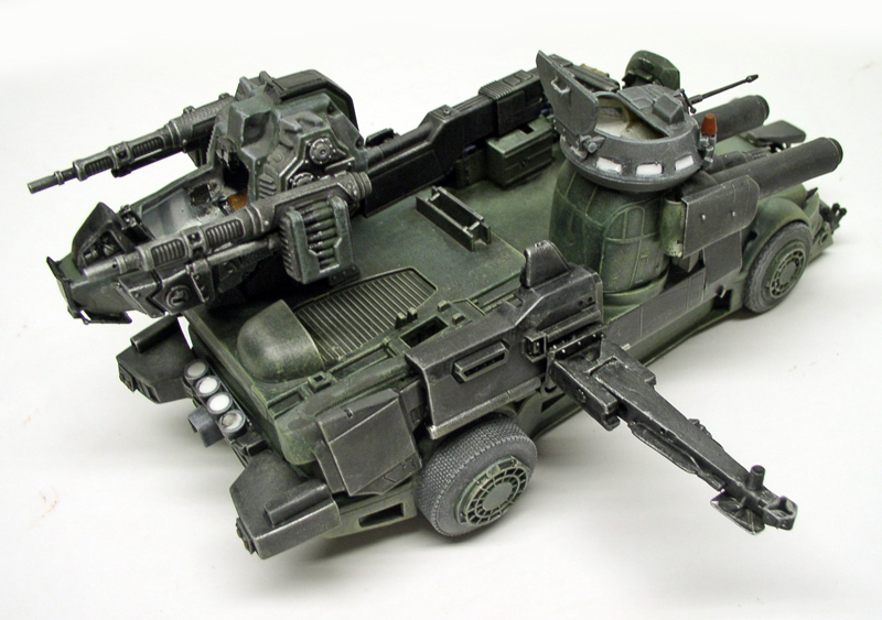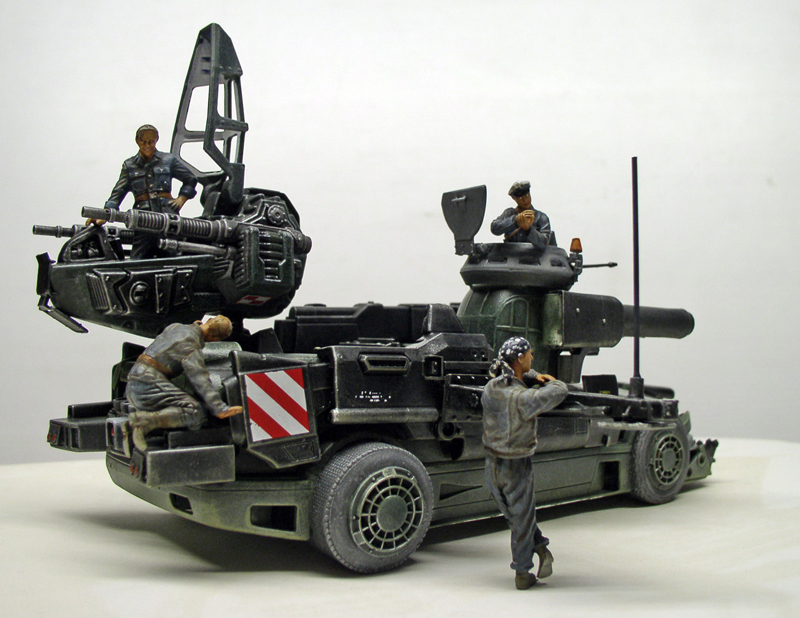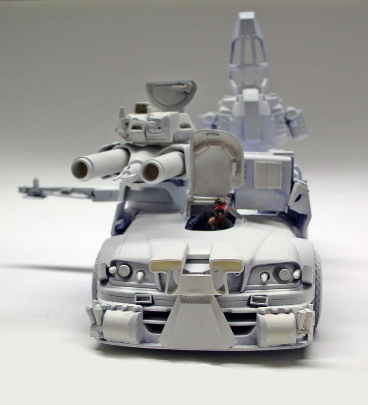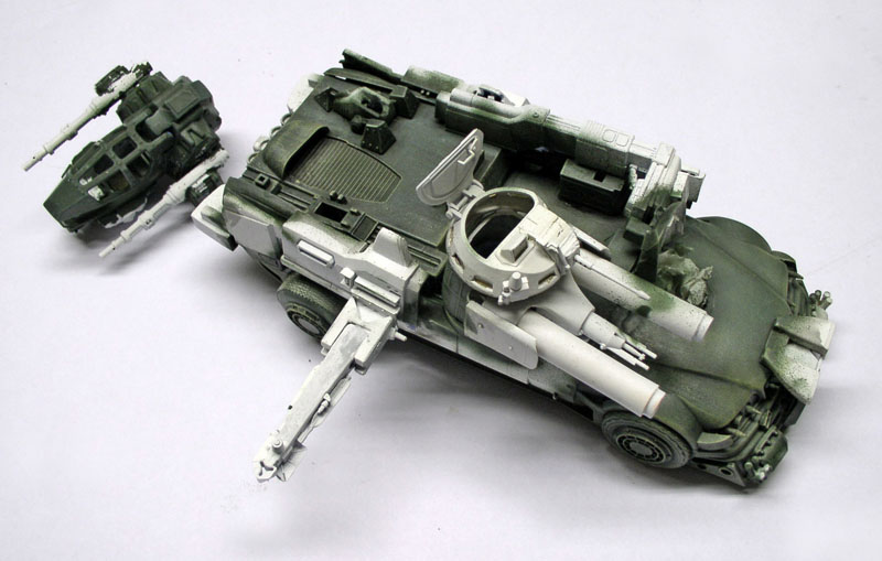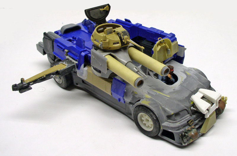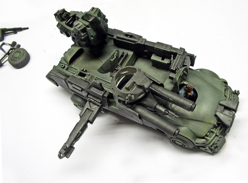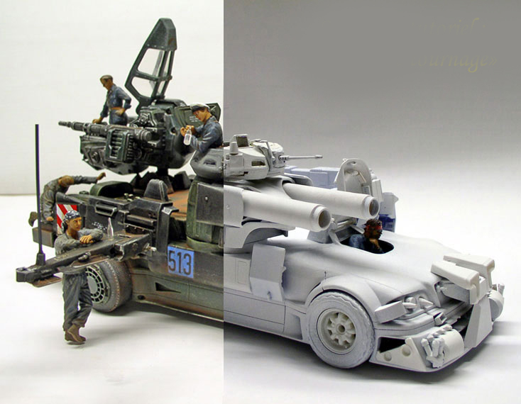 On garde les 4 roues du véhicule. Une trappe de Bradley est ajoutée sur le capot pour loger le conducteur et un tourelleau sur les deux canons en résine. Une patte repliable est insérée sur le côté...