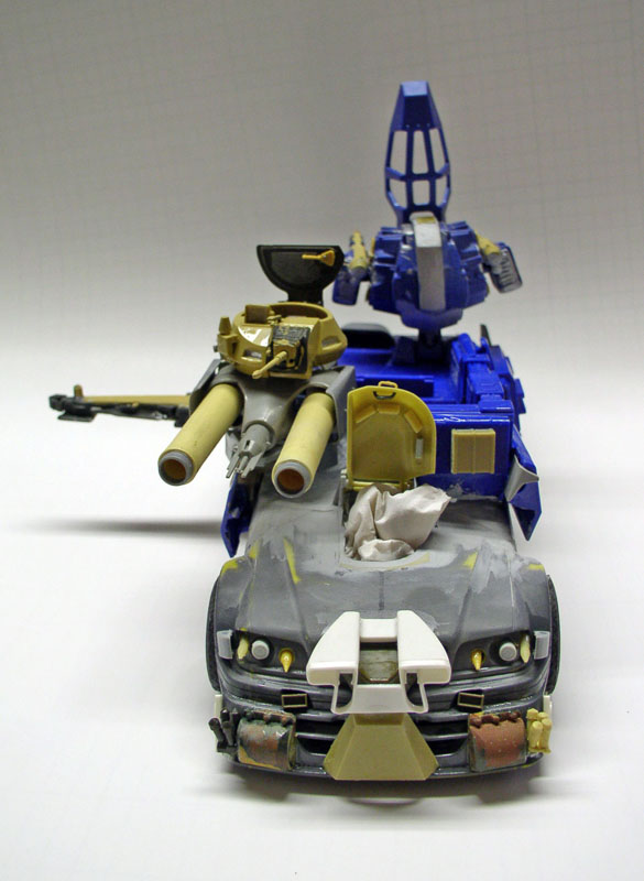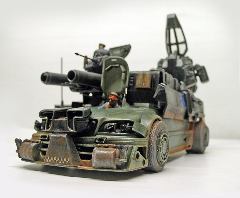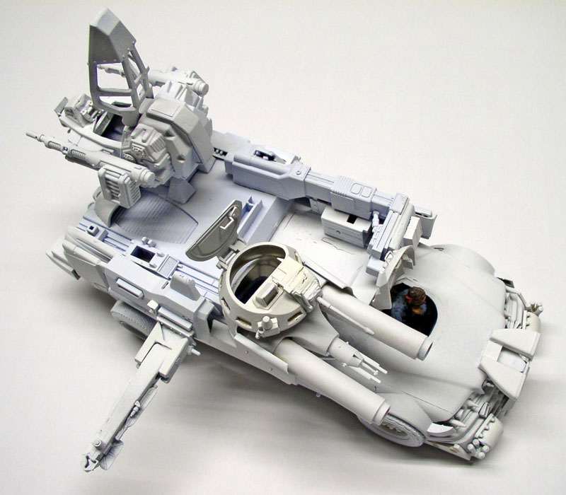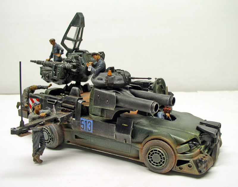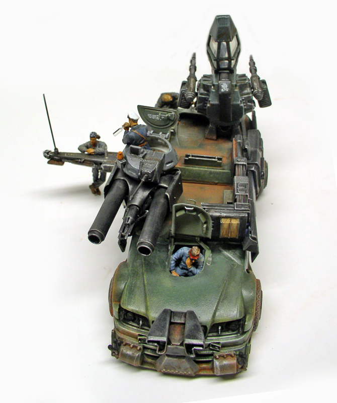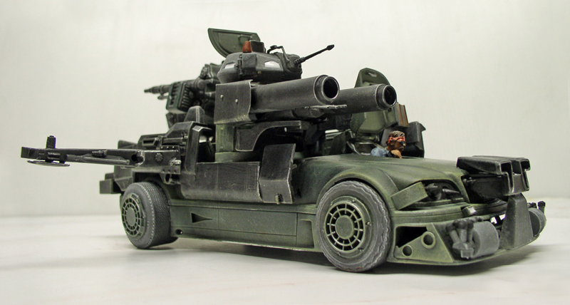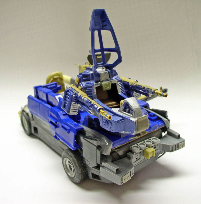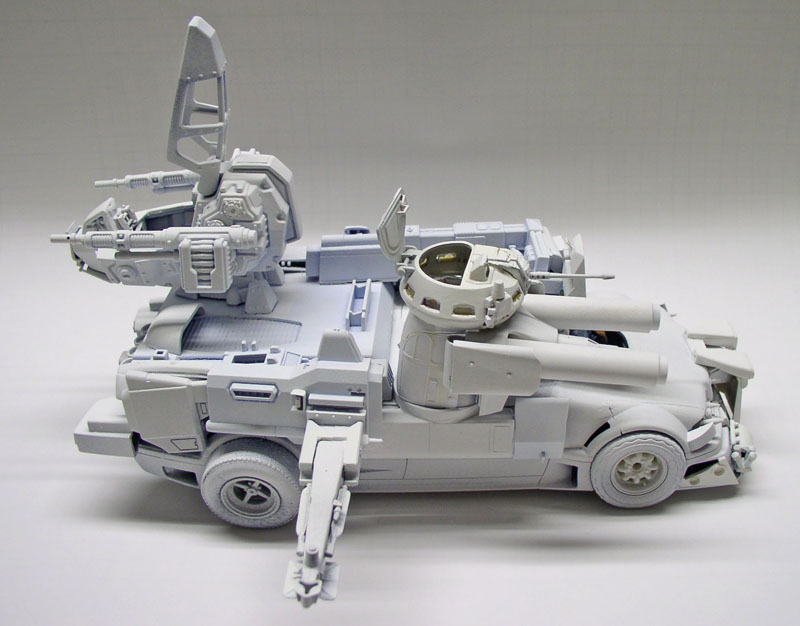 On garde les 4 roues du véhicule. Une trappe de Bradley est ajoutée sur le capot pour loger le conducteur et un tourelleau sur les deux canons en résine. Une patte repliable est insérée sur le côté...
