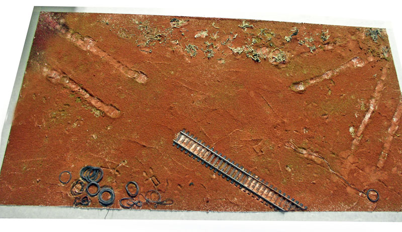 Le sol est fixé à base de sable rouge à la colle à bois ainsi que le rail de la caméra et les herbes. Les traces de pneus sont également créées...