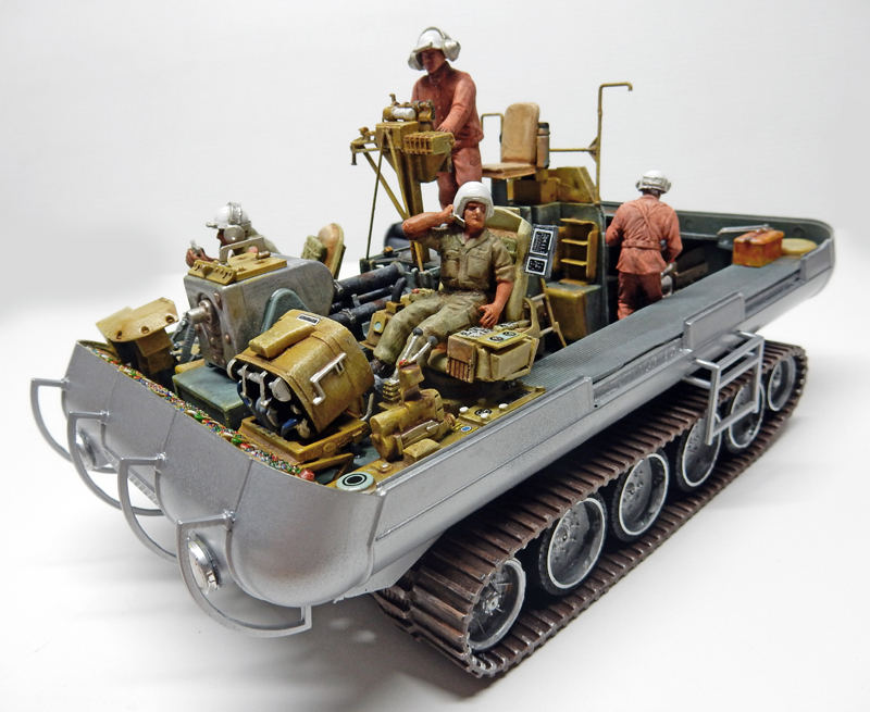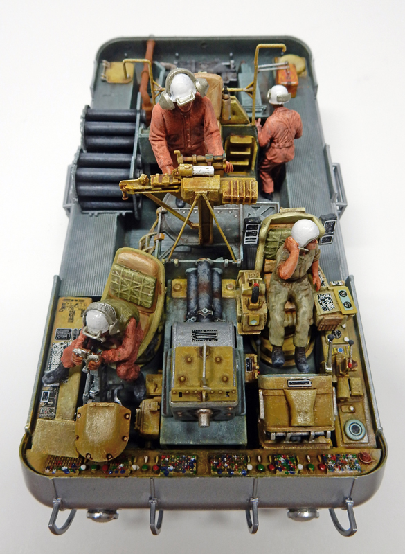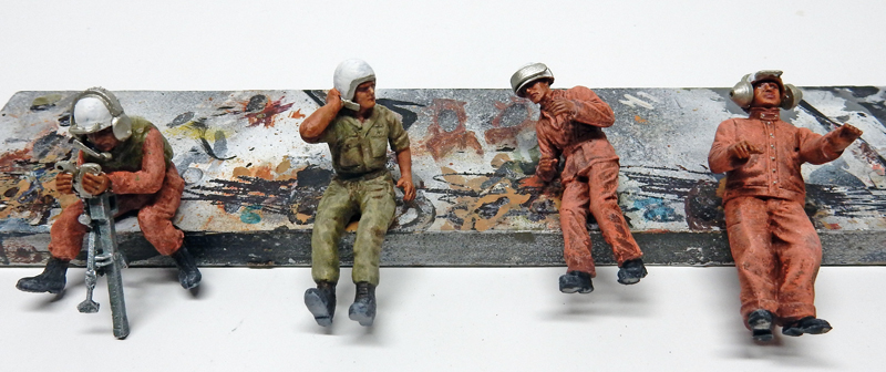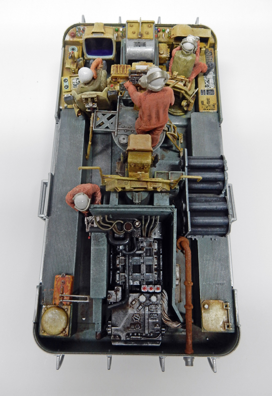 Donc, elles sont assemblées en fonction des poses prévues, peintes à l'huile Winsor & Newton pour la chair et Humbrol pour le reste. L'équipier à gauche gère le mécanisme qui contrôle le robot qui évolue à l'extérieur...