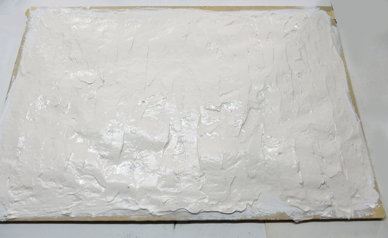 Une plaque de contreplaqué de 60cm x 40cm est enduite d'une couche d'acrylique blanc pour la protéger de l'humidité. Puis on dépose de la colle à carrelage...