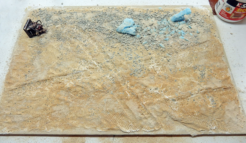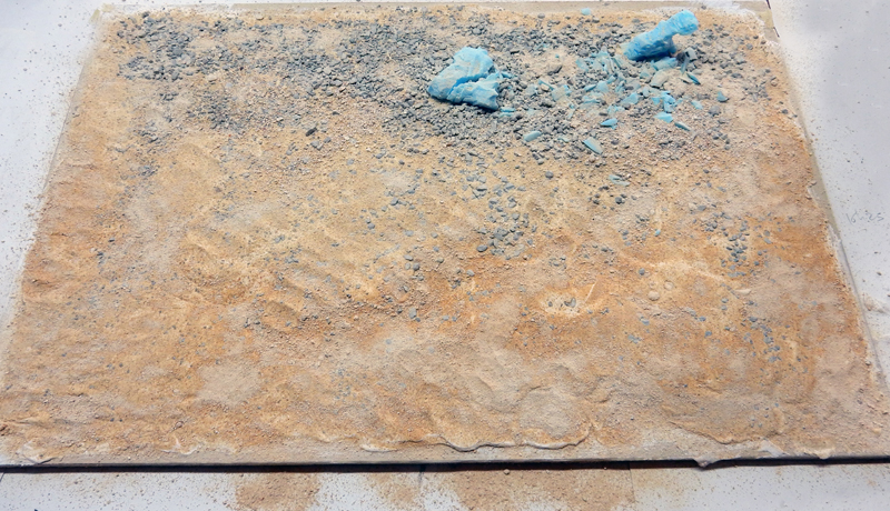 After drying completely - 24 to 48 hours - the decor is painted with acrylic in a tube and pastel powder is added to the vehicles, rocks...