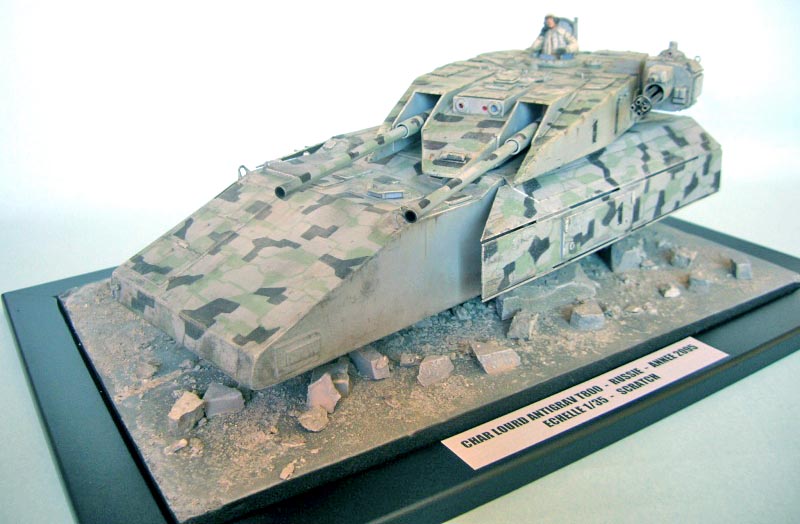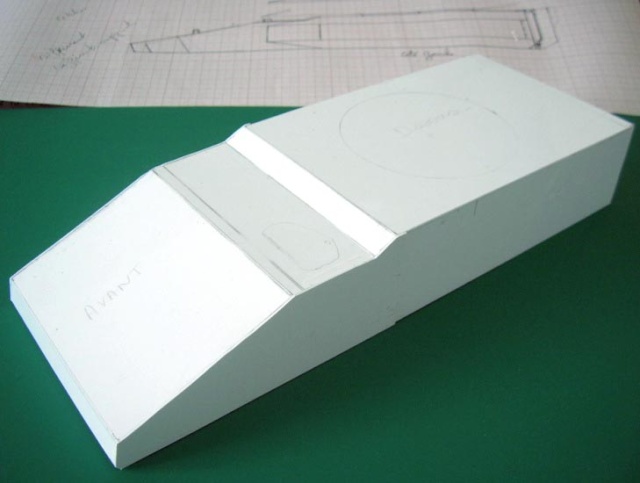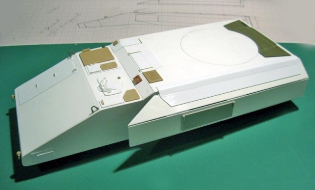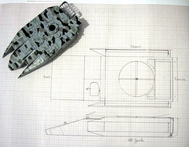 Après la tourelle, je commence "le corps de la bête" par des plans sur papier millimétré (j'en avais fait de même pour la tourelle). En haut à gauche, la tourelle avec son camouflage urbain...