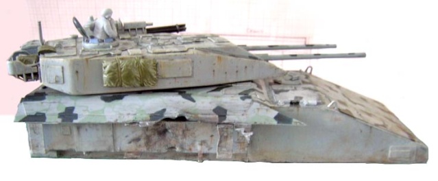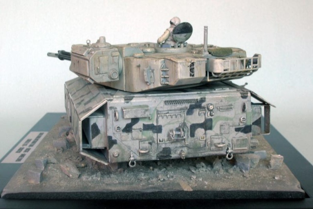 La tourelle reçoit une couche d'apprêt qui servira de couleur de base (camouflage urbain). Le coffre, l'antenne et le panier arrière proviennent du kit HELLER du char Leclerc...