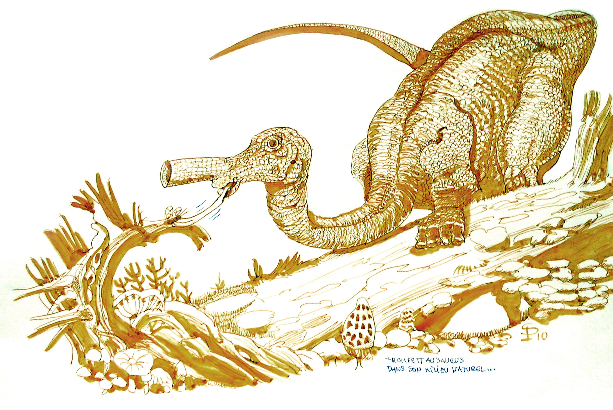 Mais de même, cette excroissance en forme de trompette l'aidait pour souffler les feuilles mortes et y découvrir les insectes rampants et occasionnellement volants. Ensuite, grâce à une fine mais longue langue qui atteignait une quarantaine de centimètres, constamment enduite d'un liquide salivaire gluant, lui permettait d'attraper sa pitance quotidienne.