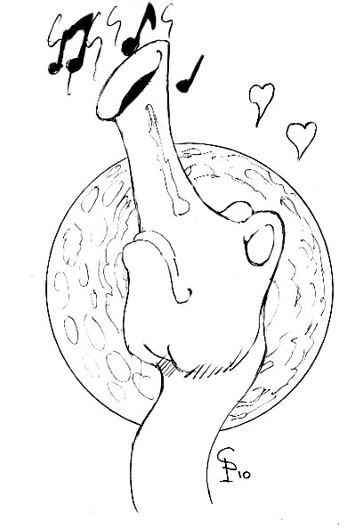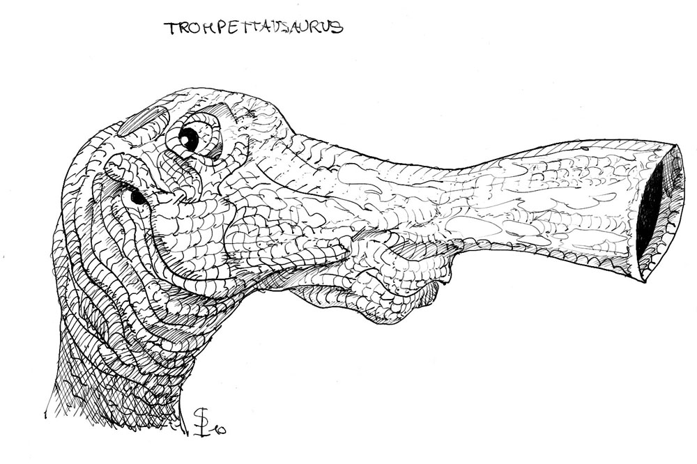 The Trumpettosaurus blows dead leaves with its trumpet-shaped nose, and emits ultrasound at the same time, scaring off small animals which are then snatched up by its retractable tongue...