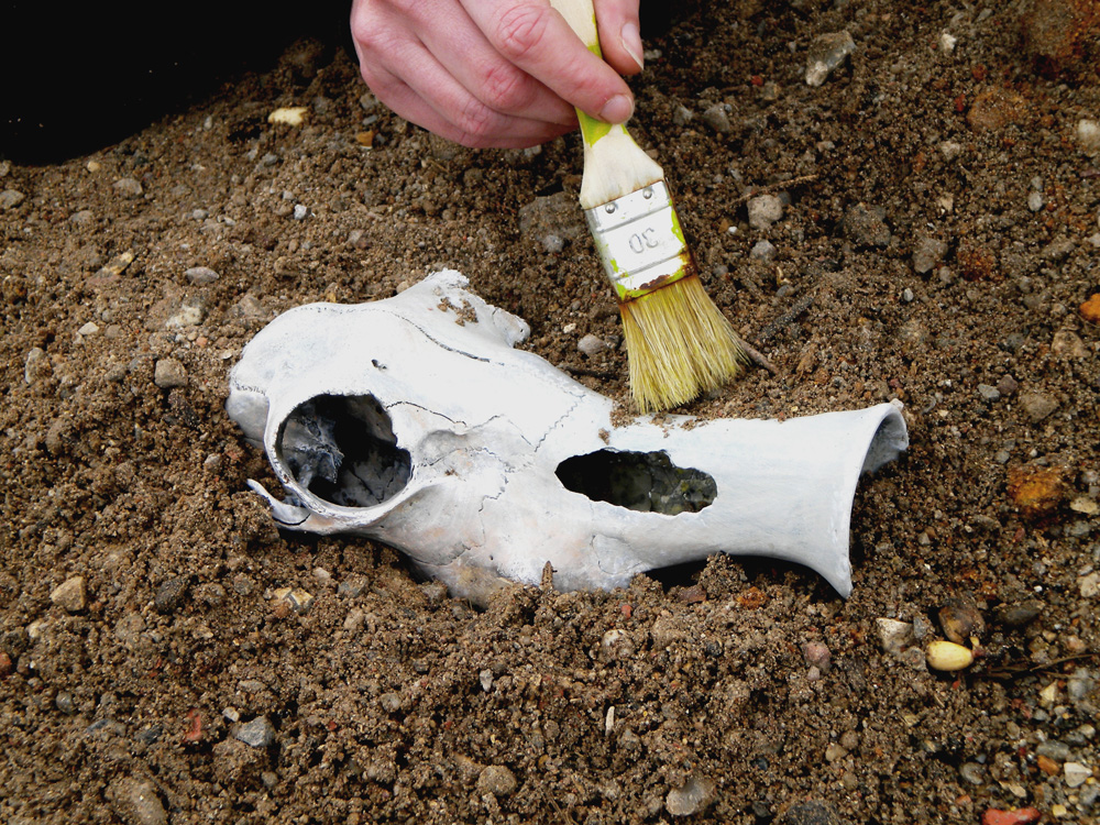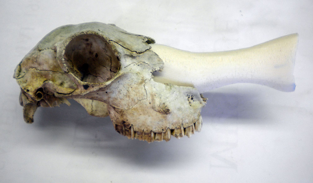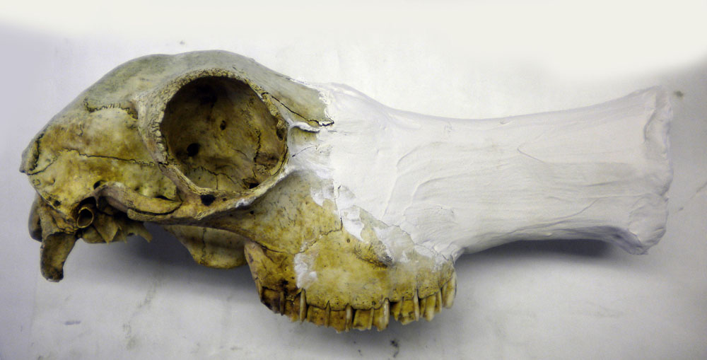 On sculpte les jointures des os pour faire le raccord et quelques "dégâts", comme la partie manquante latérale due à l'usure du temps. L'ensemble est ensuite peint et vieilli à l'acrylique Liquitex pour donner l'aspect de vieux ossements...
