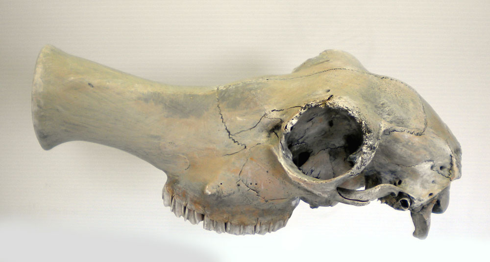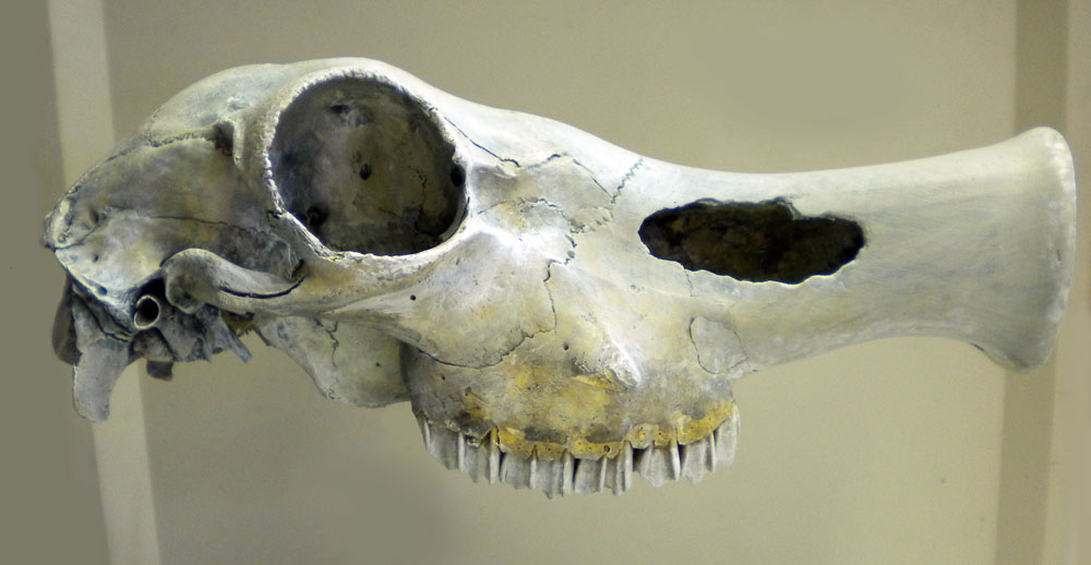 Fossilized ornithischian reptile from the end of the Secondary Era (Upper Cretaceous), also known as the trumpet snout dinosaur. In fact, the air sucked in through the mouth came out powerfully through the nose, forming a kind of wind instrument that no doubt served to amplify its cries.