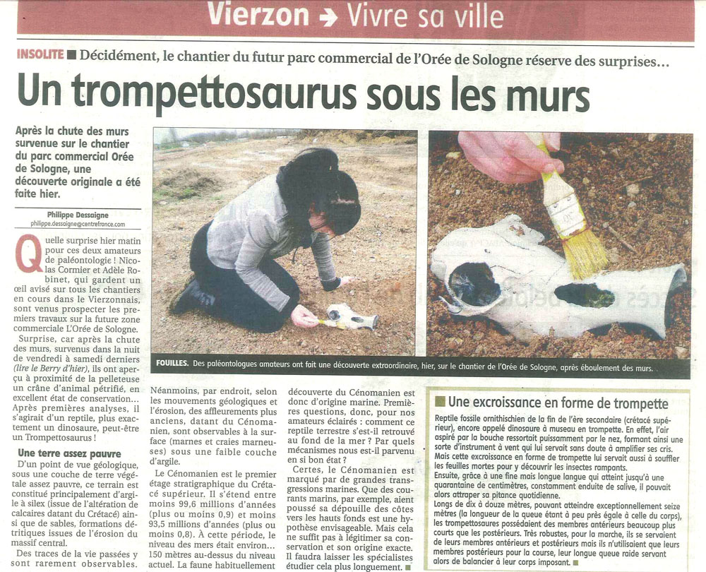 Quelle surprise hier matin pour ces deux amateurs de paléontologie - Nicolas Cormier & Adèle Robinet qui, gardant un oeil avisé sur tous les chantiers en cours sur le Vierzonnais, sont venus prospectés lors des travaux en cours sur la future zone commerciale "L'Orée de la Sologne". En regardant à proximité de la pelleteuse, ils aperçurent un crâne d'animal pétrifié, en excellent état de conservation... Après premières analyses, il s'agirait d'un reptile, plus exactement d'un dinosaure !