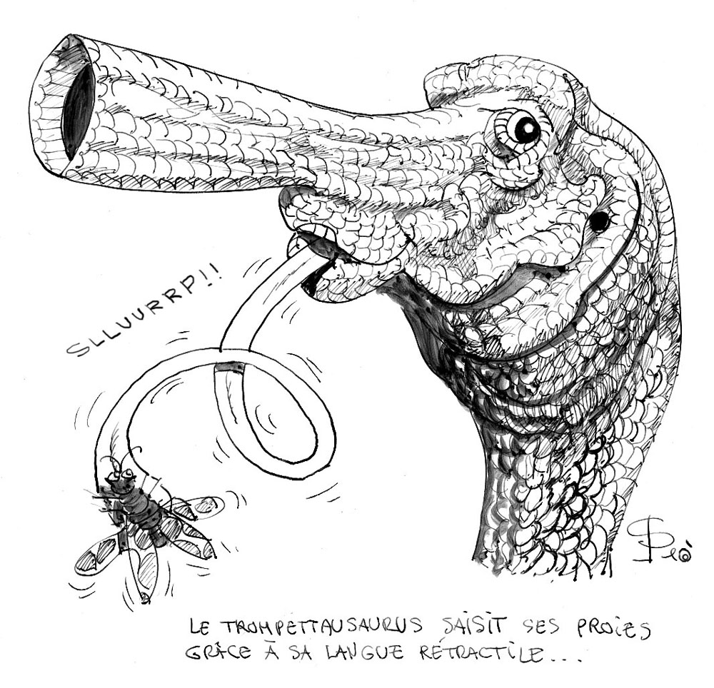 Le Trompettosaurus souffle avec son nez en forme de trompette les feuilles mortes, et, de plus, il émet des ultrasons par la même occasion qui font fuir les petits animaux qui sont ensuite happés par sa langue rétractile...