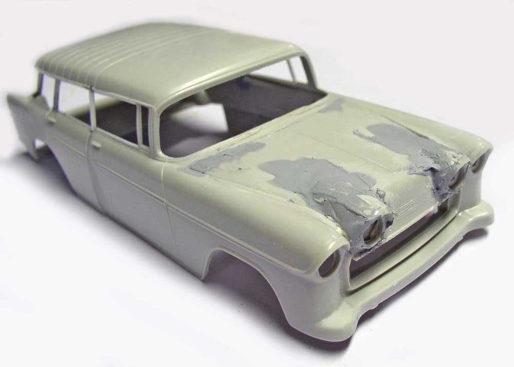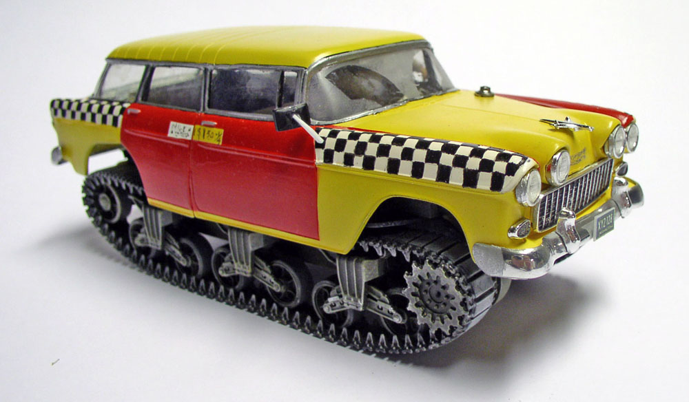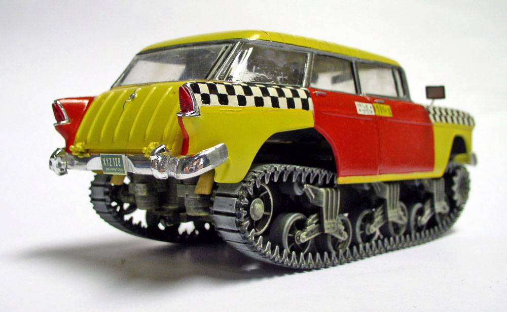 Le modèle du dessin se rapprochant des taxis new-yorkais et bien qu'évasif, entre une Chevrolet 58 ou une Chrysler, j'ai opté - pour simplifier la tâche tout en la compliquant - pour un break 55 auquel j'allais doubler les phares à l'aide de deux kits...