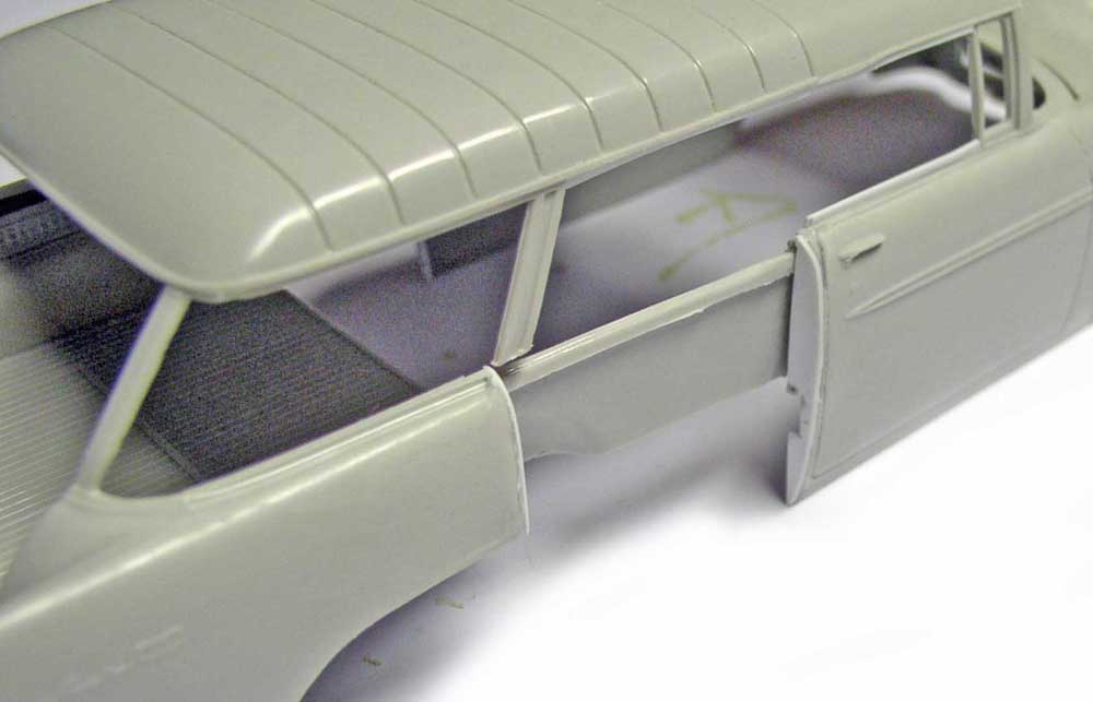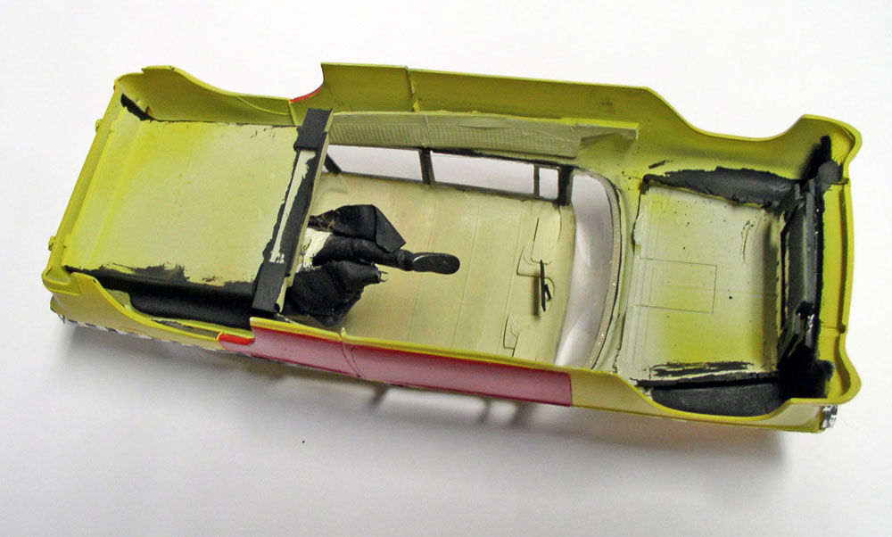 Le passager et la banquette arrière sont collés sur la coque (collage pas évident). Pose des pare-soleil et d'un rétroviseur central...