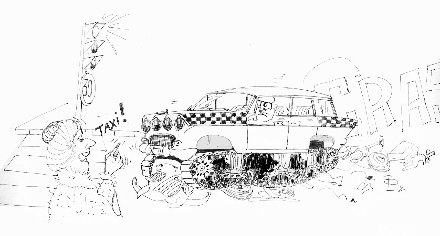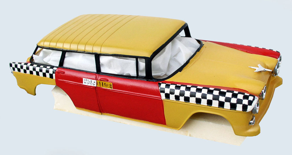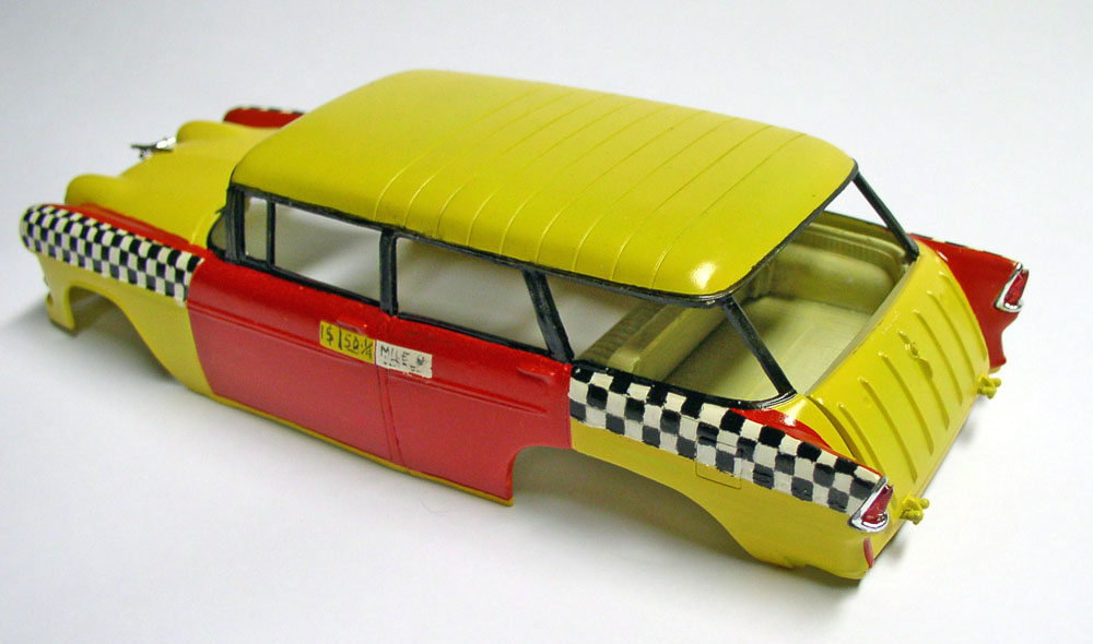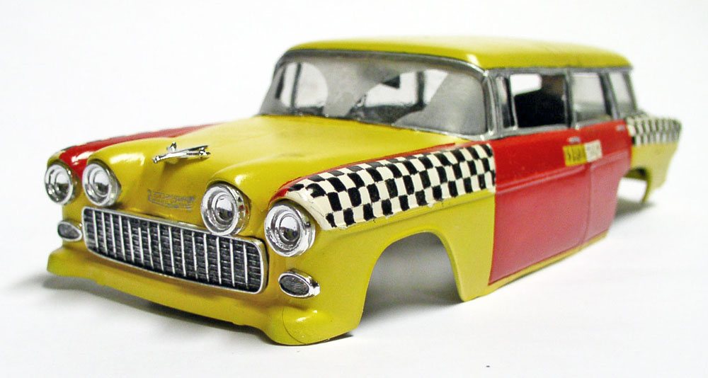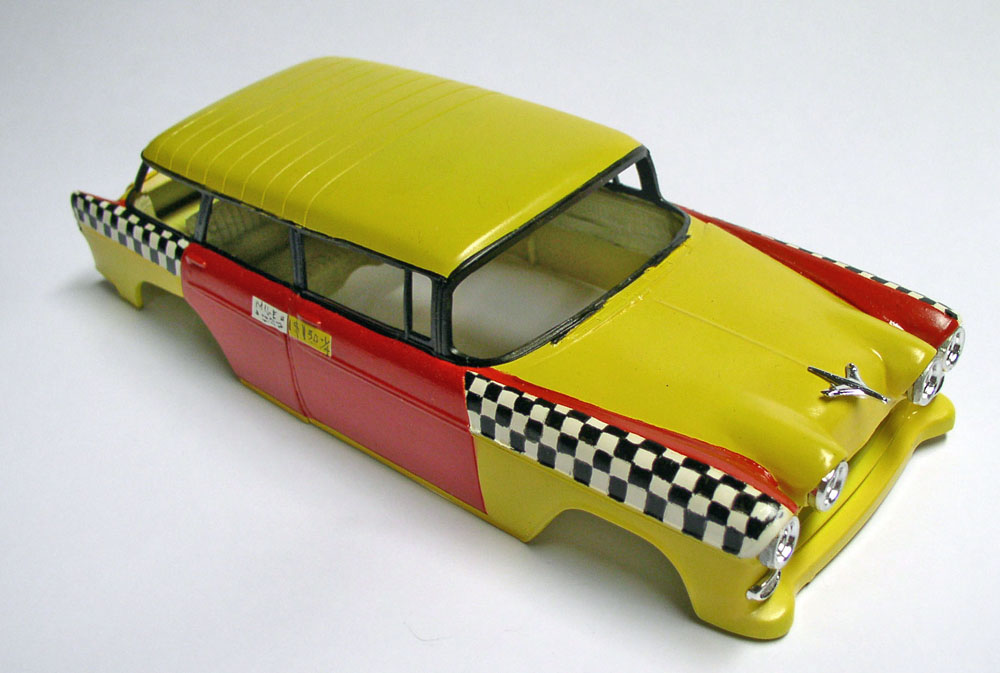 As the model in the drawing was close to a New York cab, and although I couldn't decide between a '58 Chevy or a Chrysler, I opted - to simplify the task while at the same time complicating it - for a '55 station wagon to which I was going to double up the headlights using two kits...