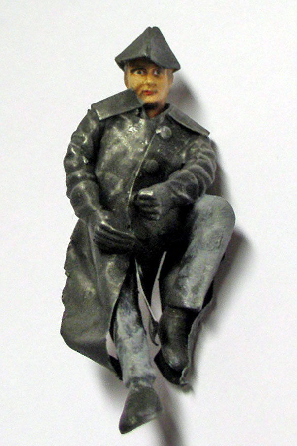 The figurine is shaped to resemble the drawing. Opposite, the hat and raincoat are made from lead sheet...