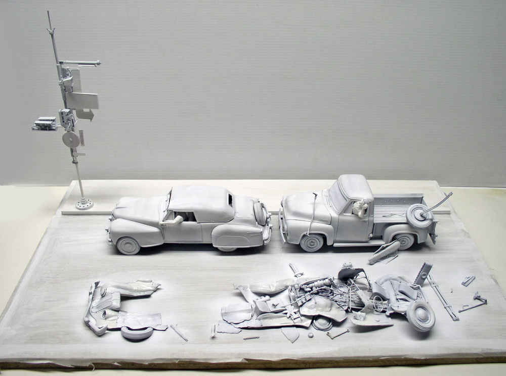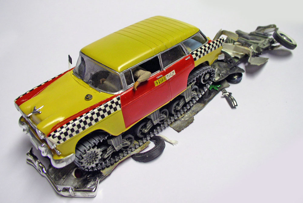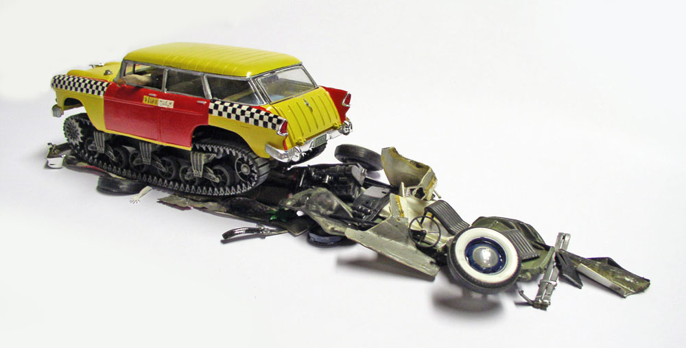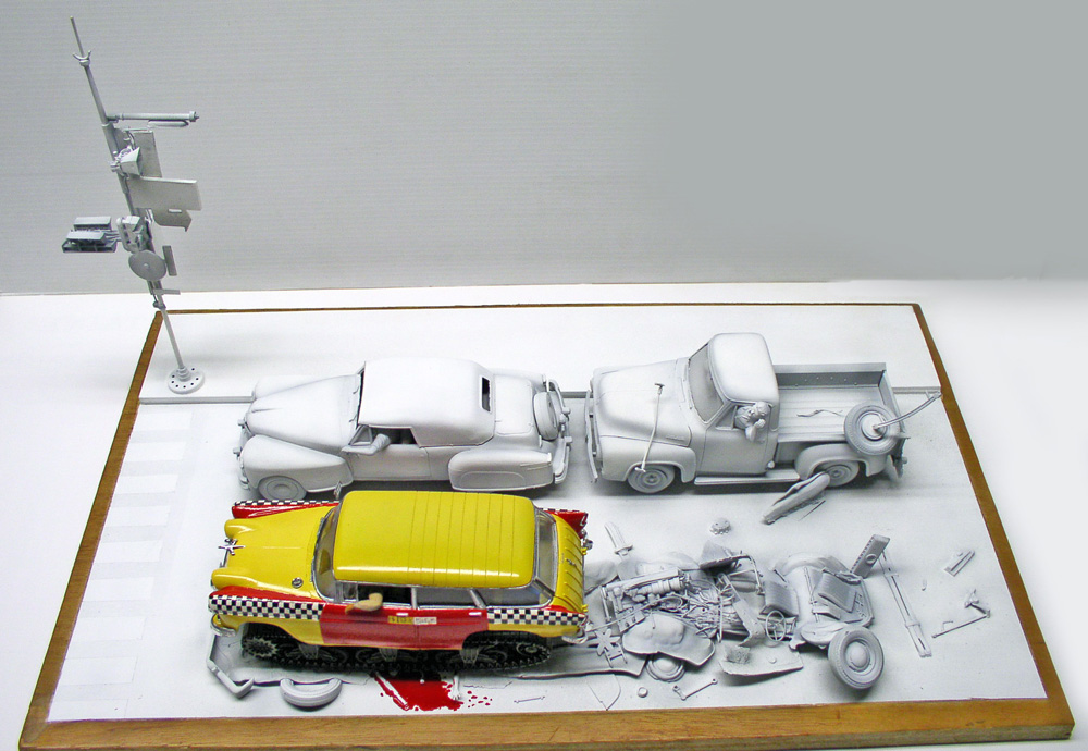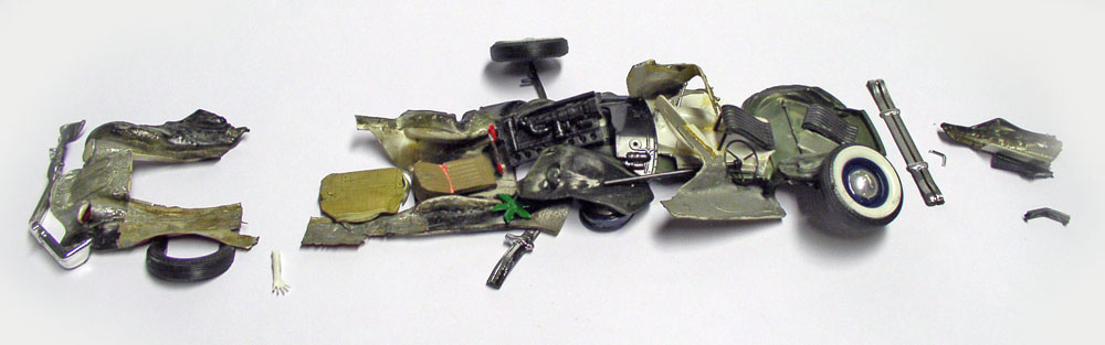 Taxi-crushed vehicles. Some parts are heated to deform them. Pieces of lead sheet were used to simulate crumpled metal...