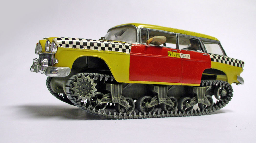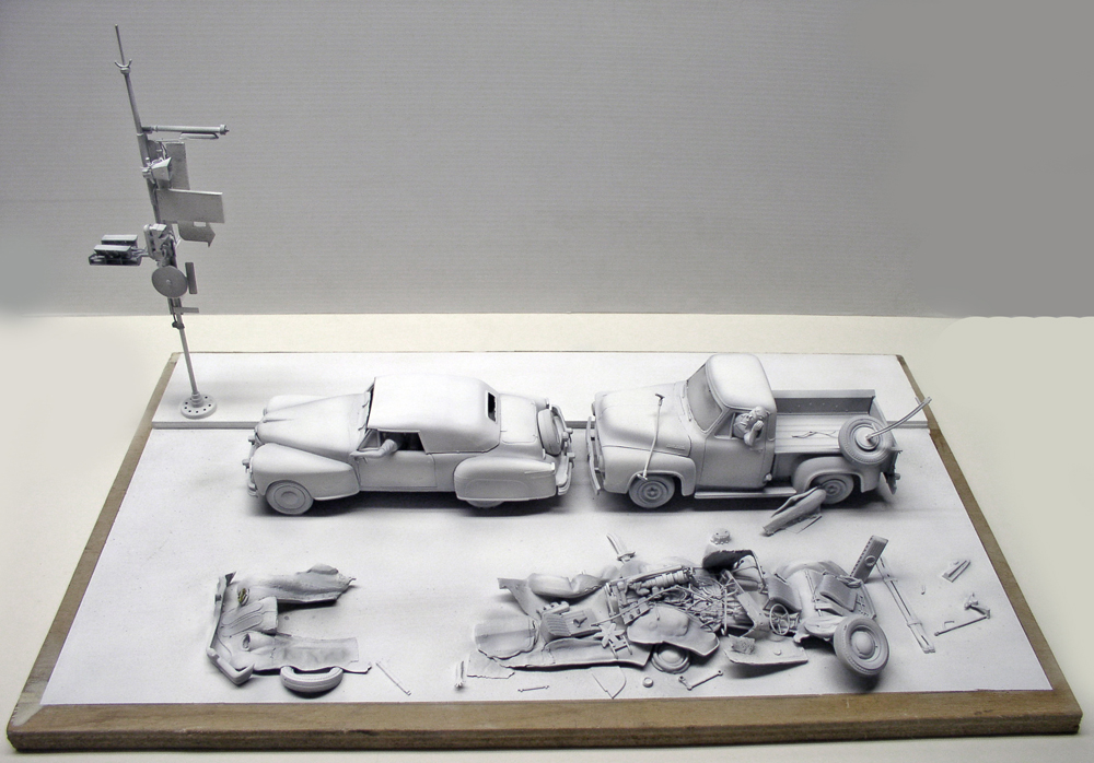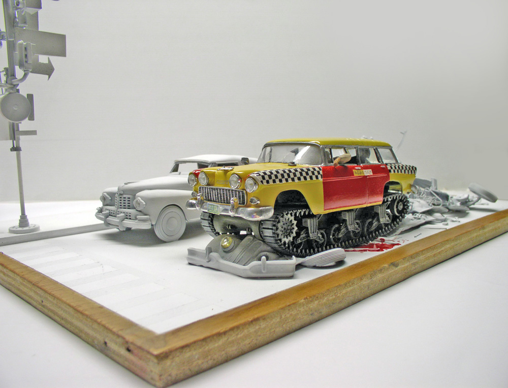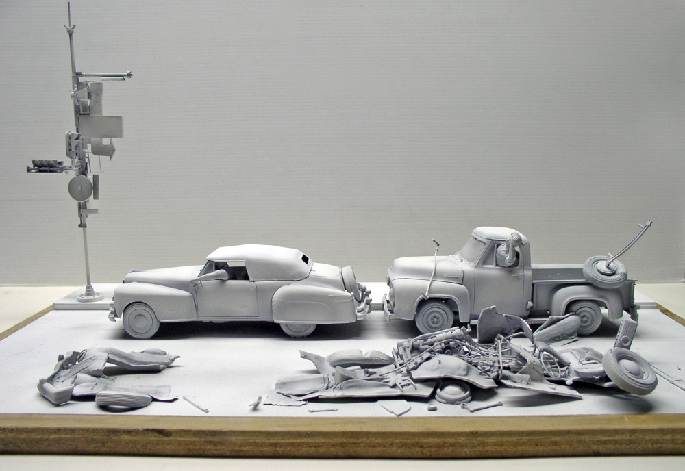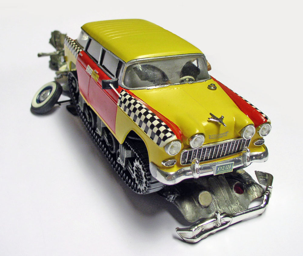 Taxi-crushed vehicles. Some parts are heated to deform them. Pieces of lead sheet were used to simulate crumpled metal...
