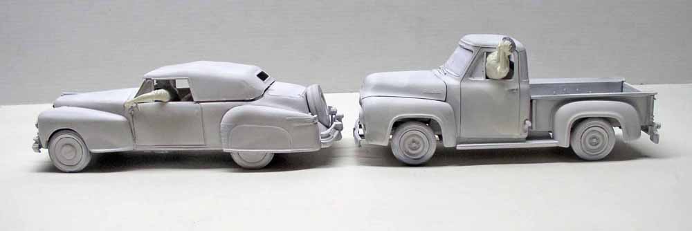 Vehicles waiting at the light in the right-hand lane along the sidewalk. A Lincoln and a Ford whose drivers have been added. All painted white...