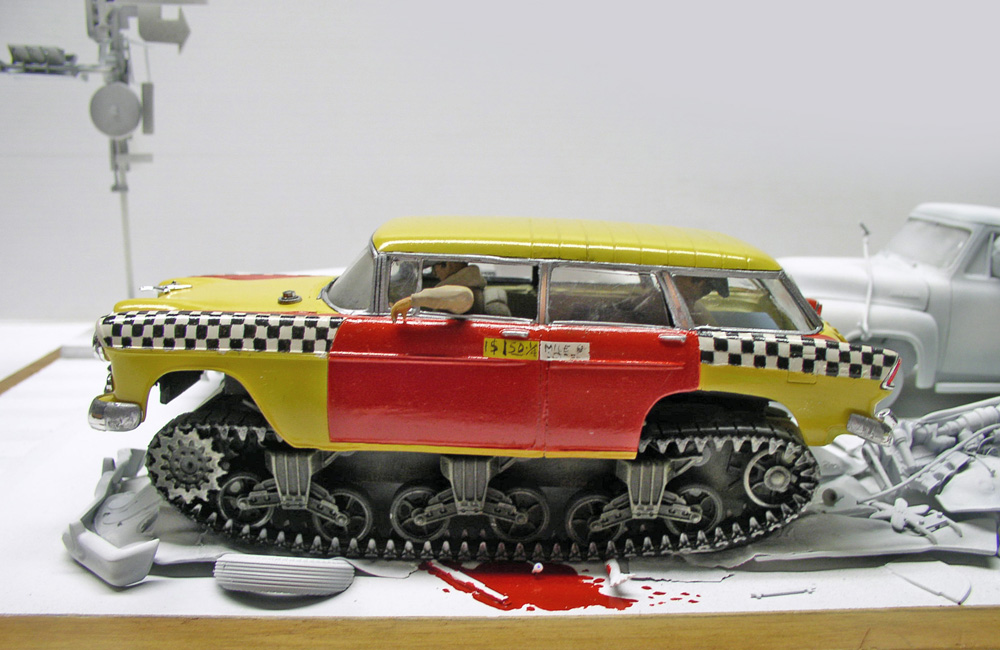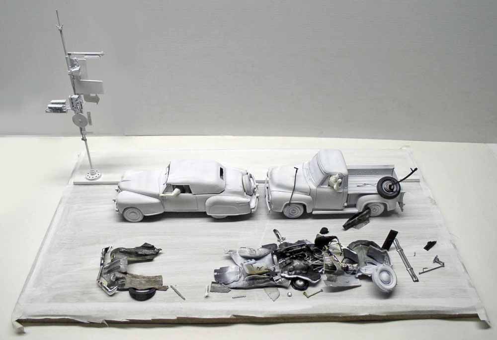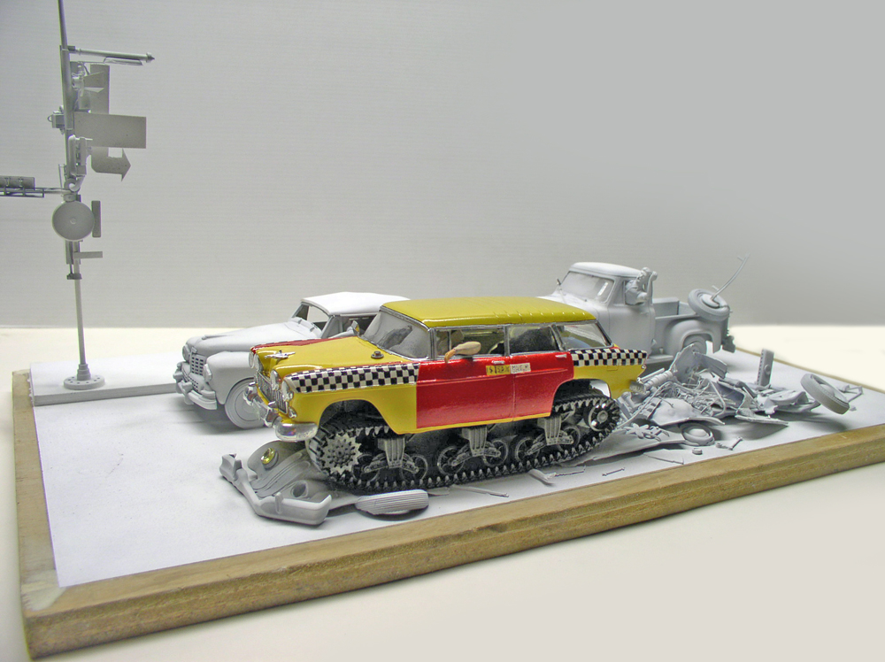 Les véhicules écrasés par le taxi. Certaines pièces sont chauffées pour déformation. Des morceaux de feuilles de plomb ont servi à simuler la tôle froissée...