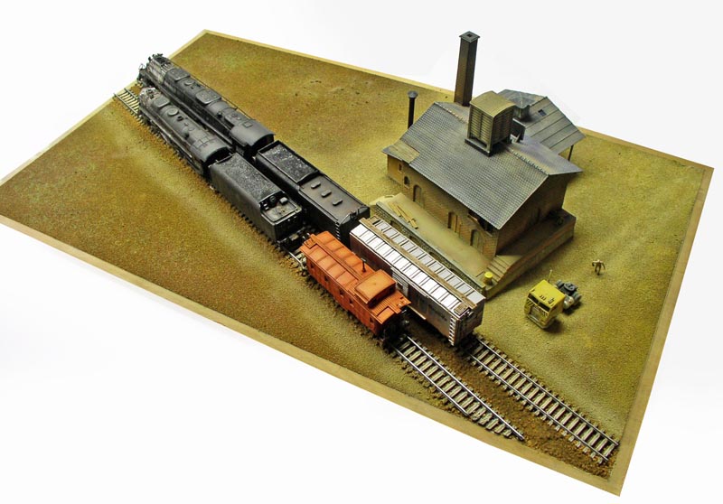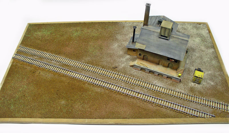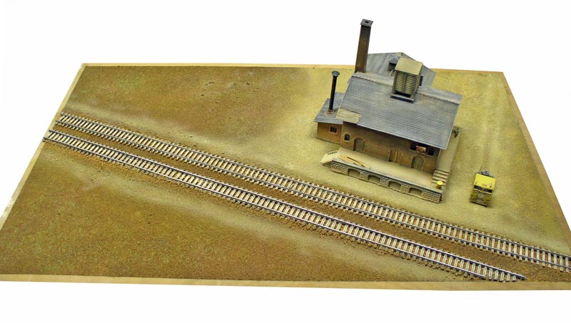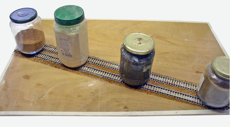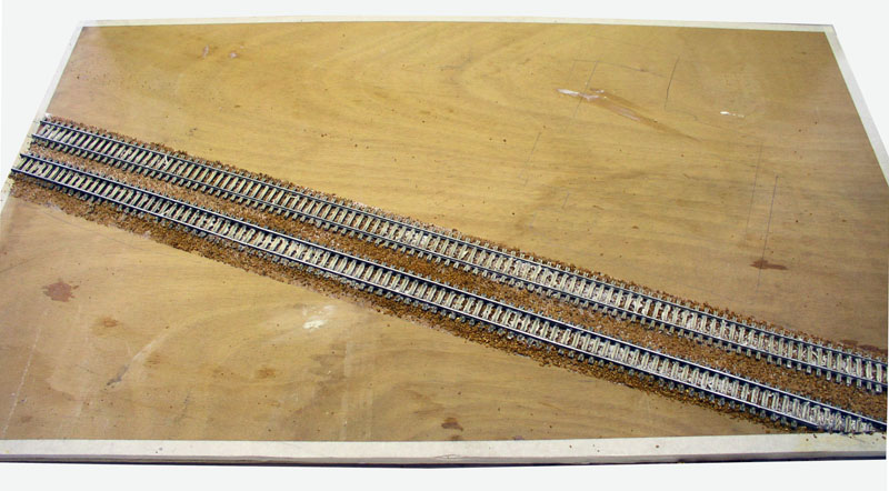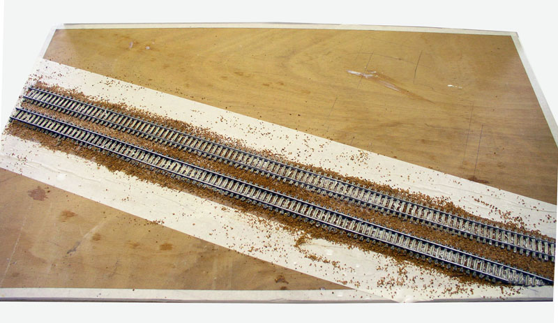 On a plywood panel, two lengths of track used for electric trains and ballast are fixed with wood glue...