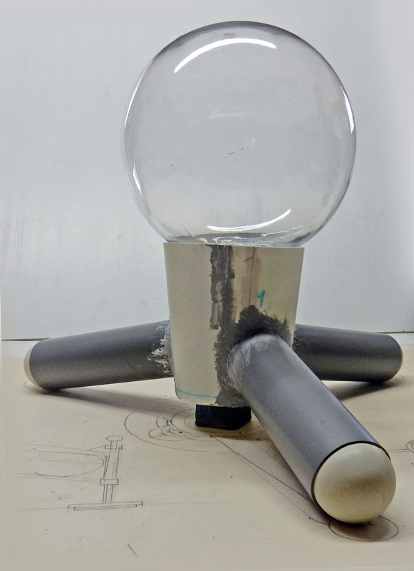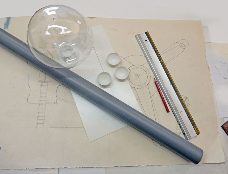 1ère chose : trouver les matériaux... A la bonne taille... Une "ampoule" d'un lustre en plastique de décoration trouvée en grand surface, des tuyaux de plomberie en pvc, des balles de ping-pong, de la carte plastique...