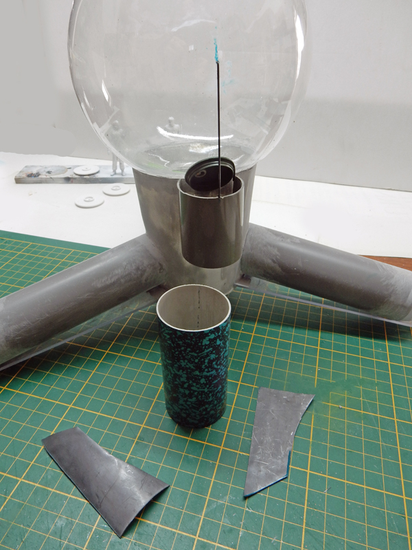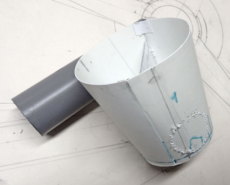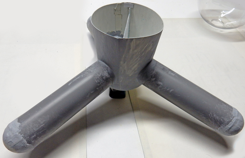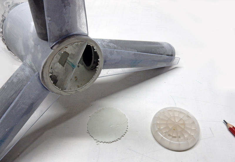 Le cône du corps de l'engin est fabriqué en carte plastique. Il est renforcé à l'intérieur. On perce 3 trous pour les futurs empâtements...
