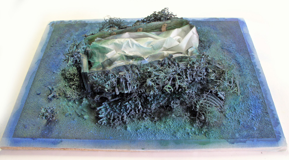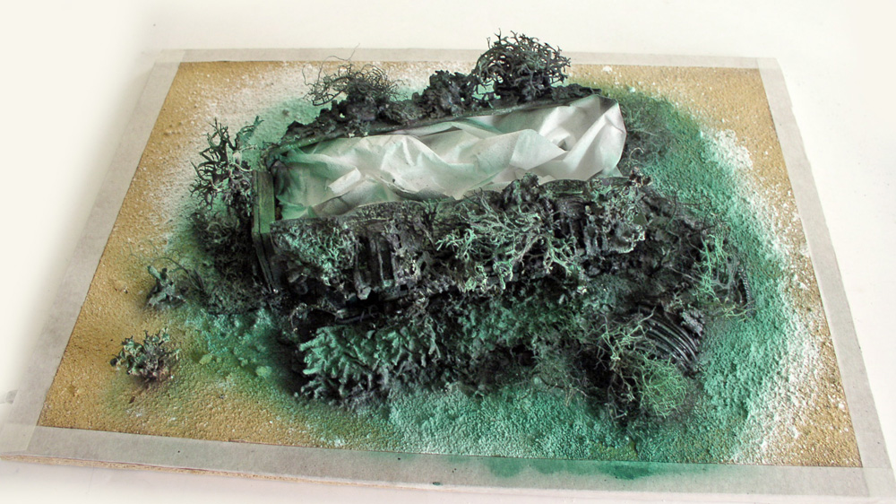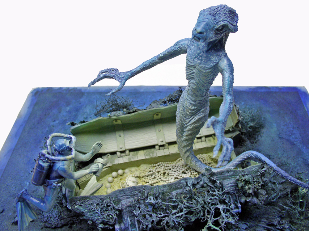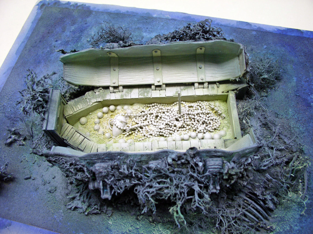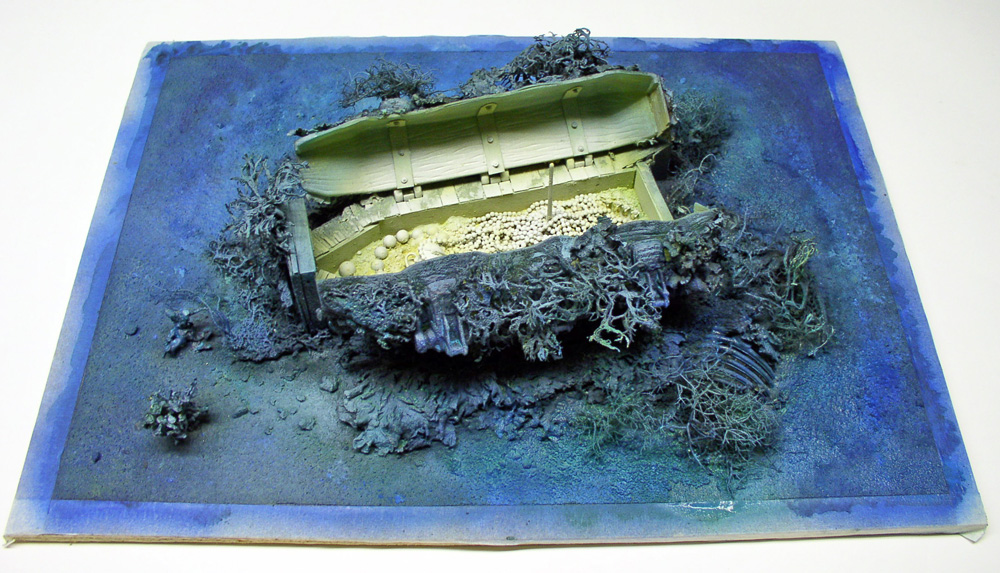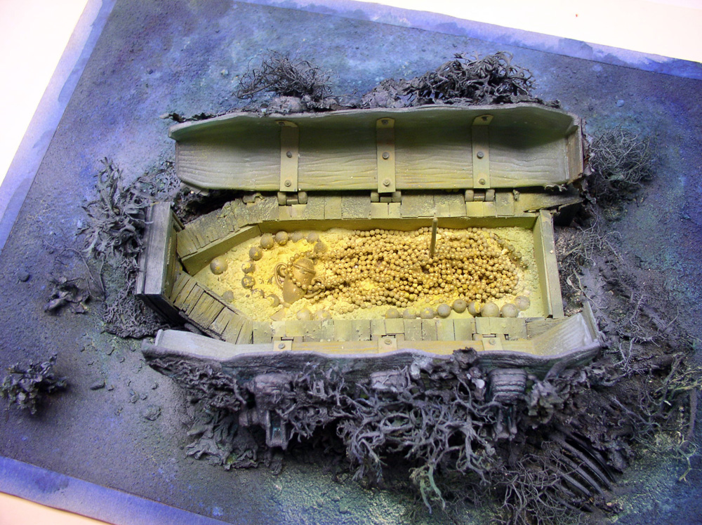 Le coffre est amélioré avec du balsa et des clous en plastique. Des perles et un trésor sont rajoutés à l'intérieur. Des ossements disposés sur le côté droit dans le sable. Le tout est habillé de lichens qui simuleront les concrétions marines incrustées sur celui-ci et le sol. On rajoute le sable avec du plâtre sec saupoudré sur le terrain mouillé...