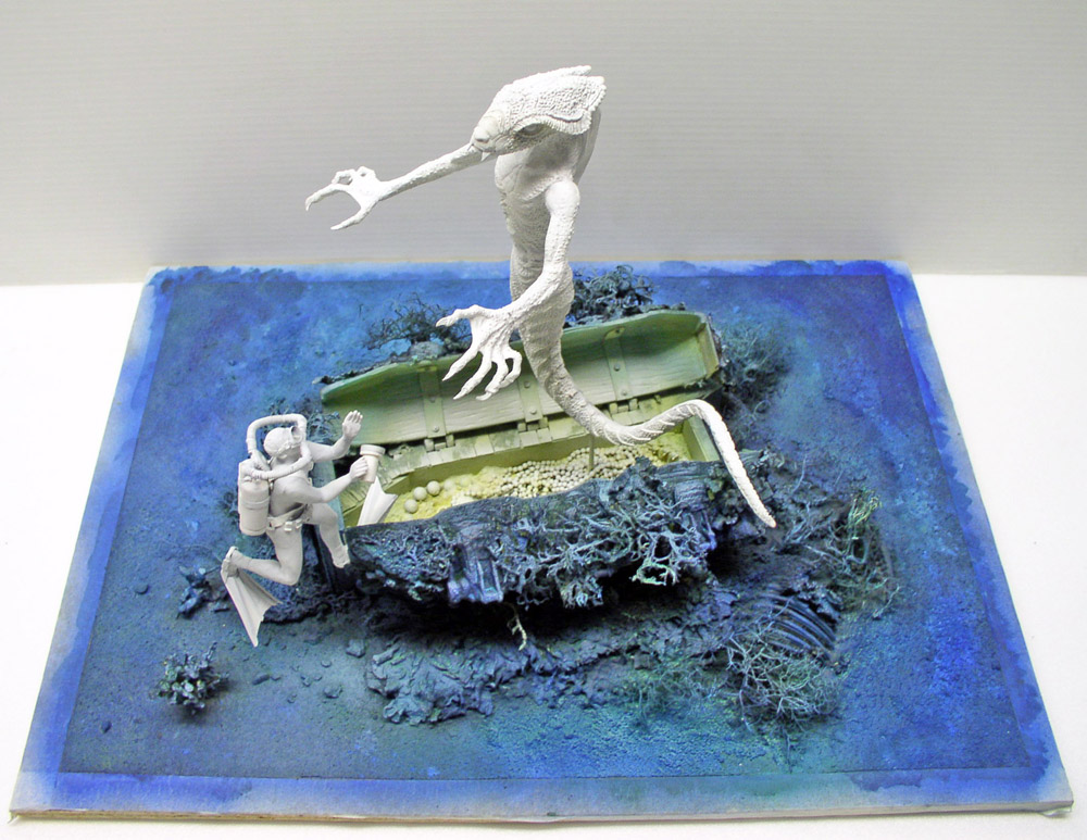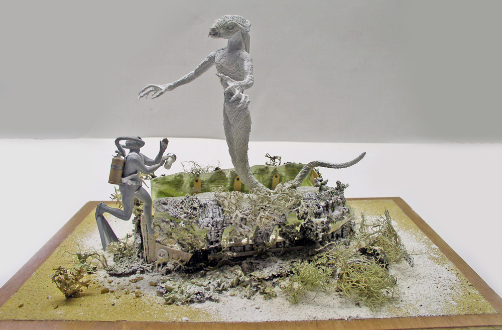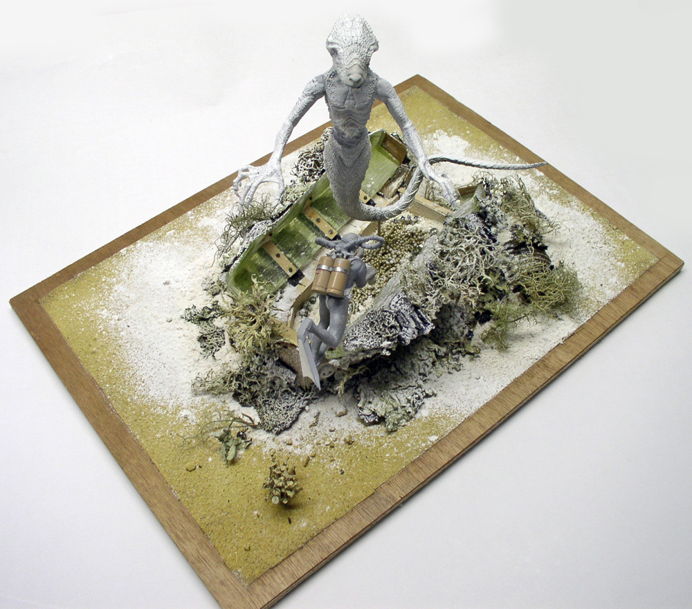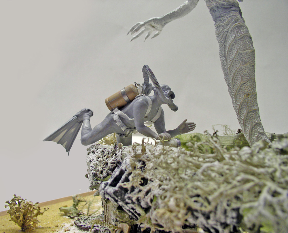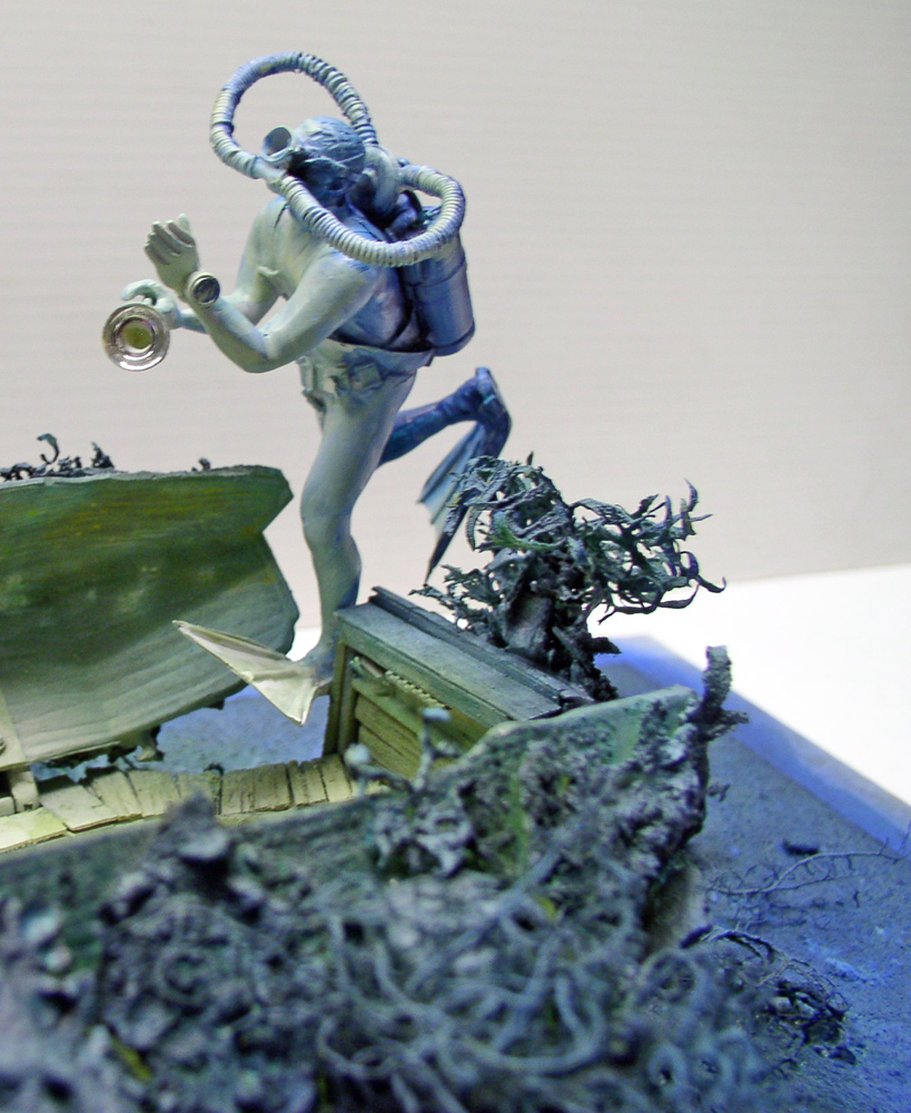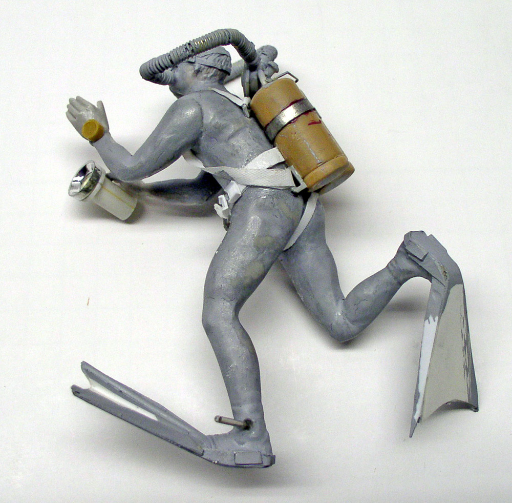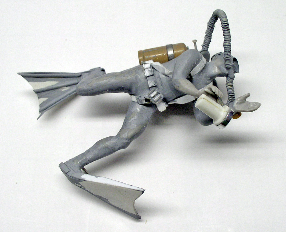 The diver is based on a Tamiya figurine. Ill is sanded to eliminate clothing. The equipment is made from plastic card. Cylinders are made from recycled gas cylinders. The corrugated hose is made from fine copper wire. Straps are made of fabric...